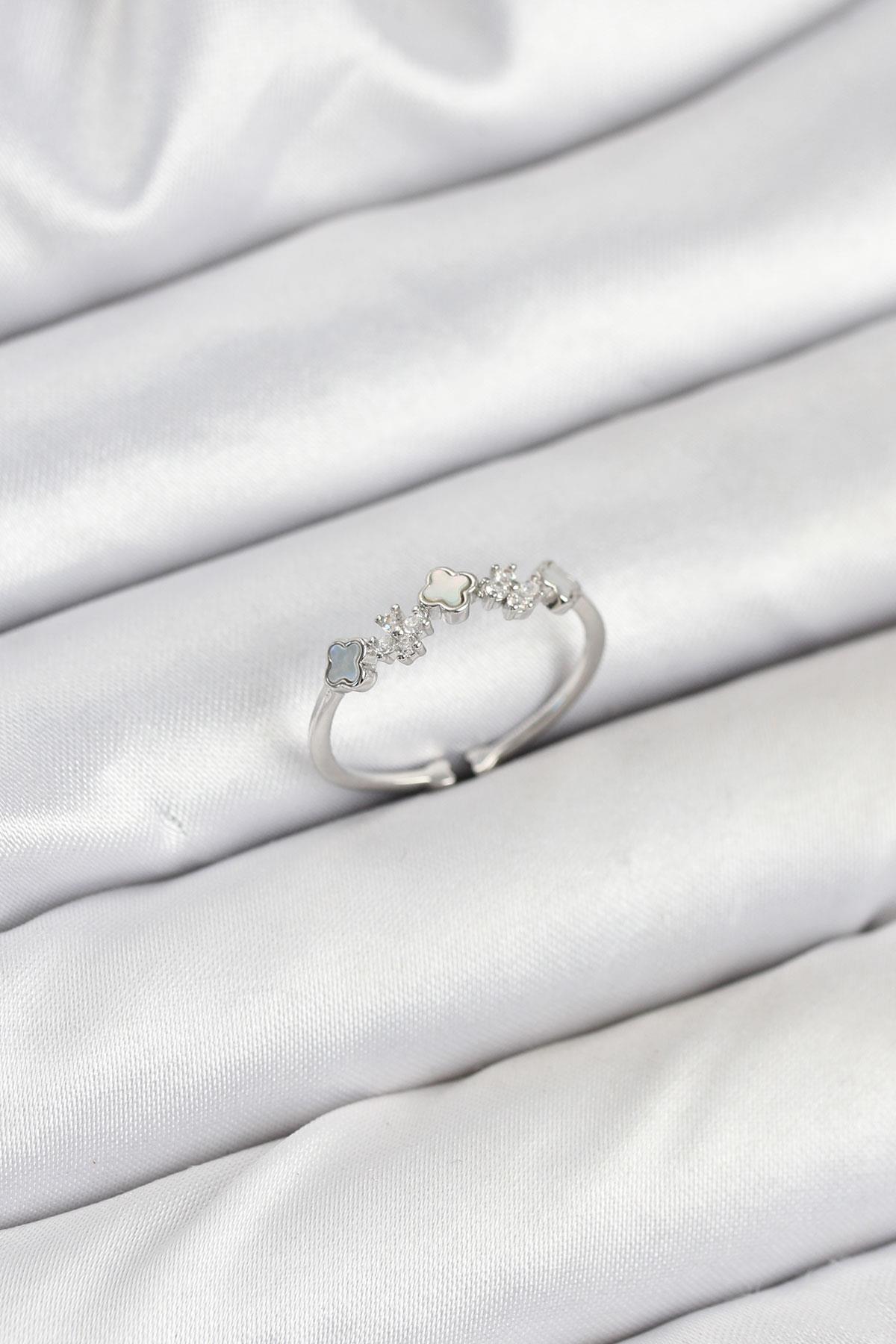 Pirinç Gümüş Renk Minimal Yonca Detaylı Kadın Yüzük (BYK3843)