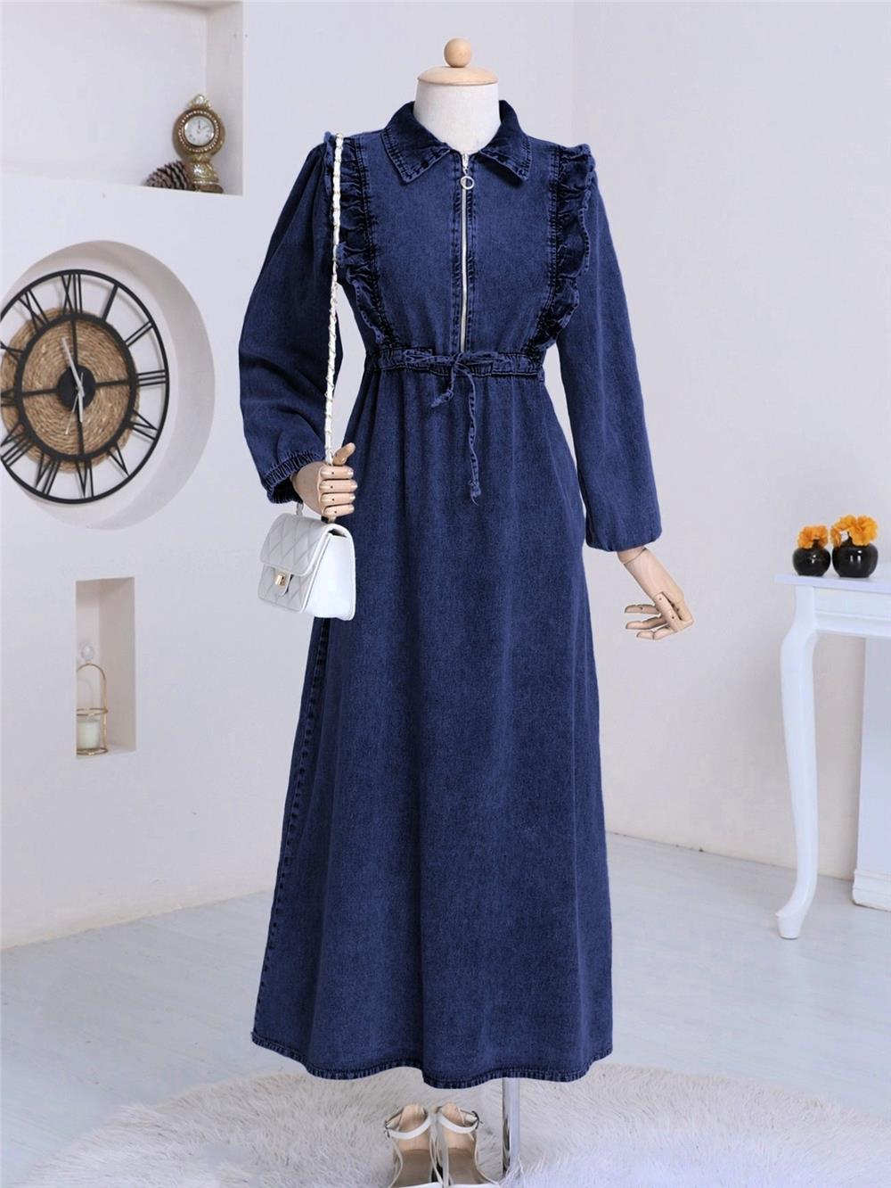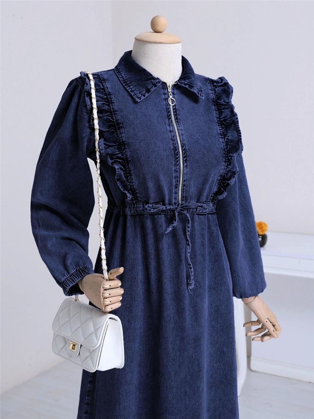 Robadan fırfırlı Belden Büzgü Kot Elbise -Laci (197-6808-R03)