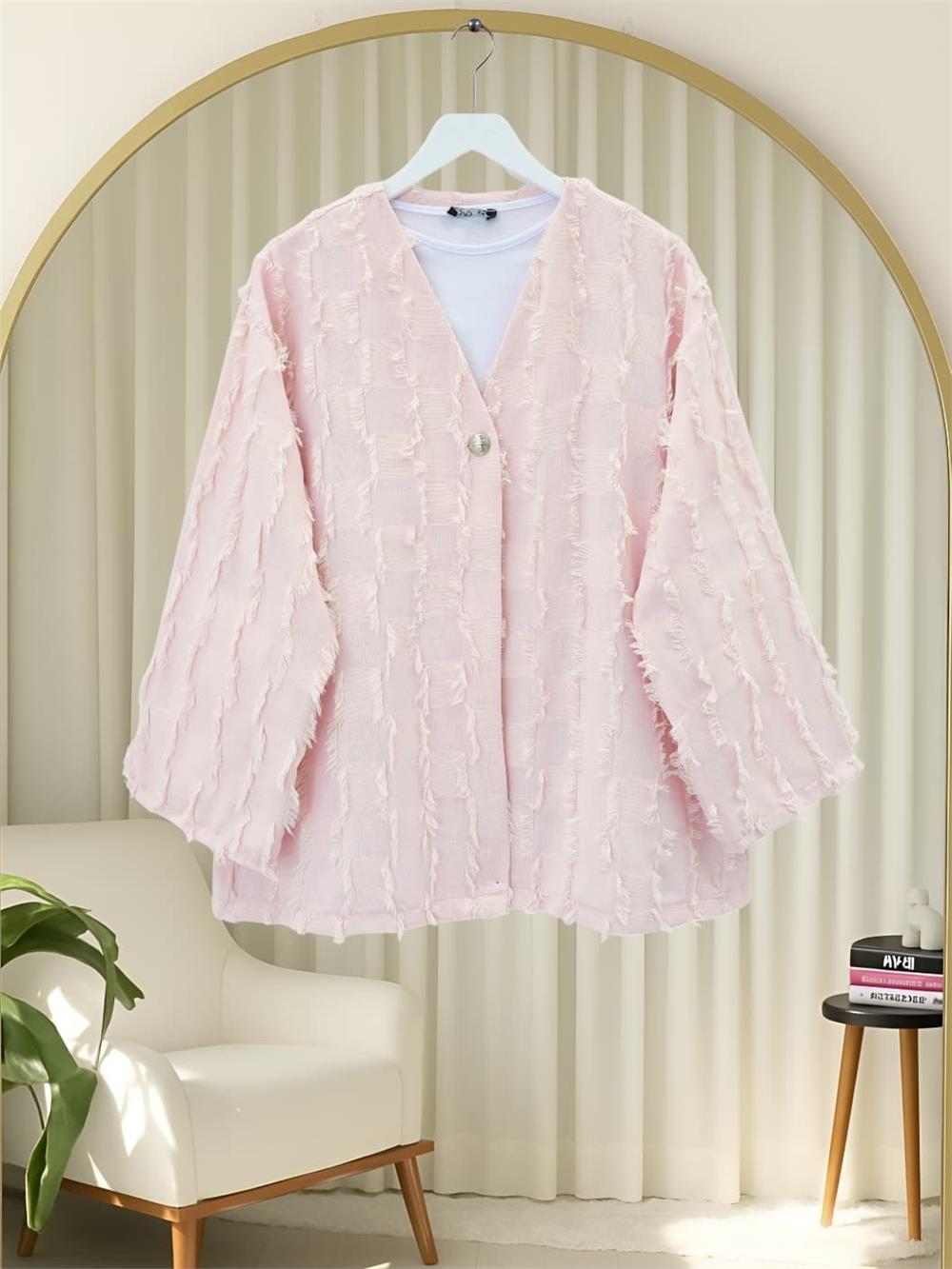 Saçaklı Tek Düğmeli Kare Desenli Kimona -Pudra (307-2376-R06)