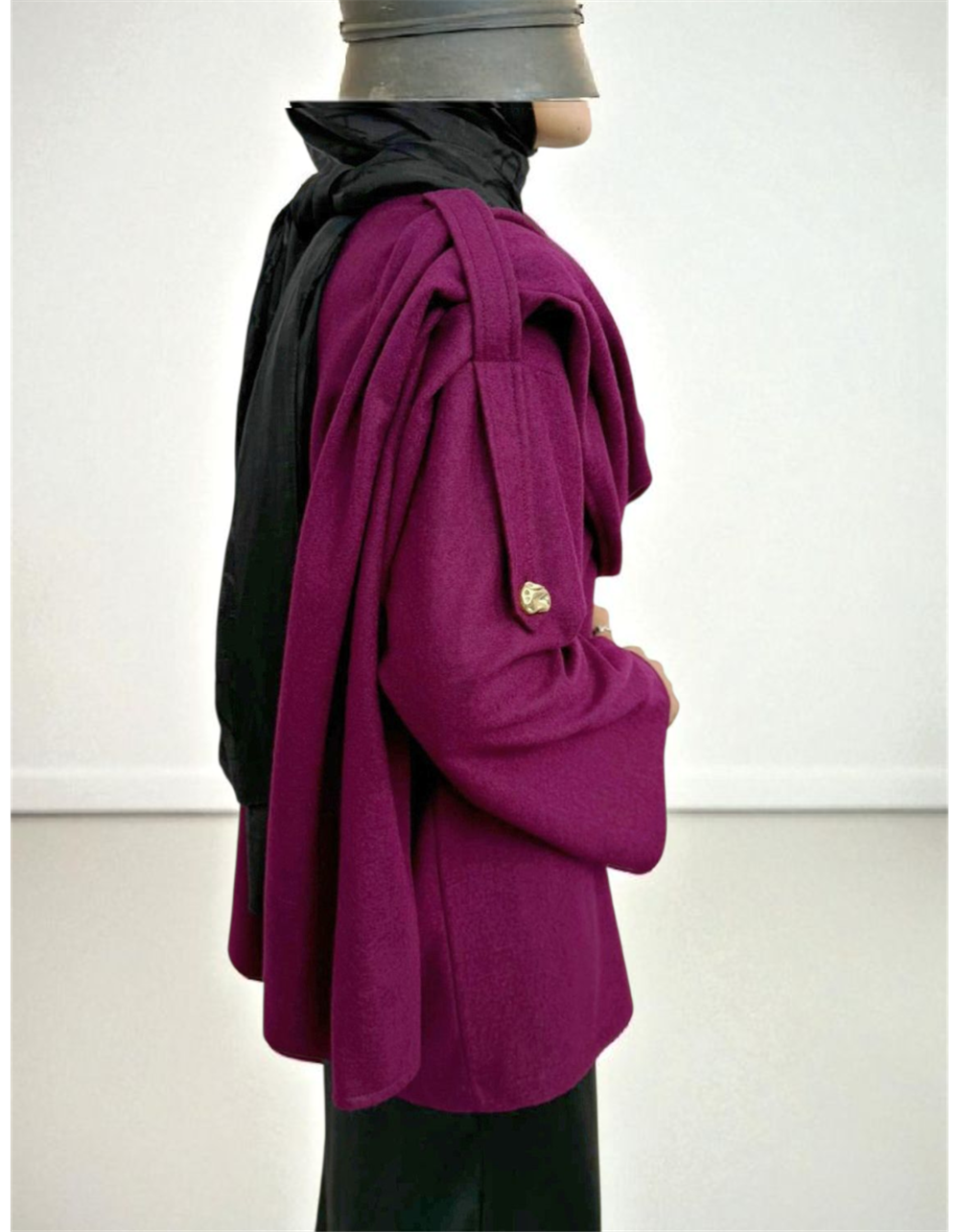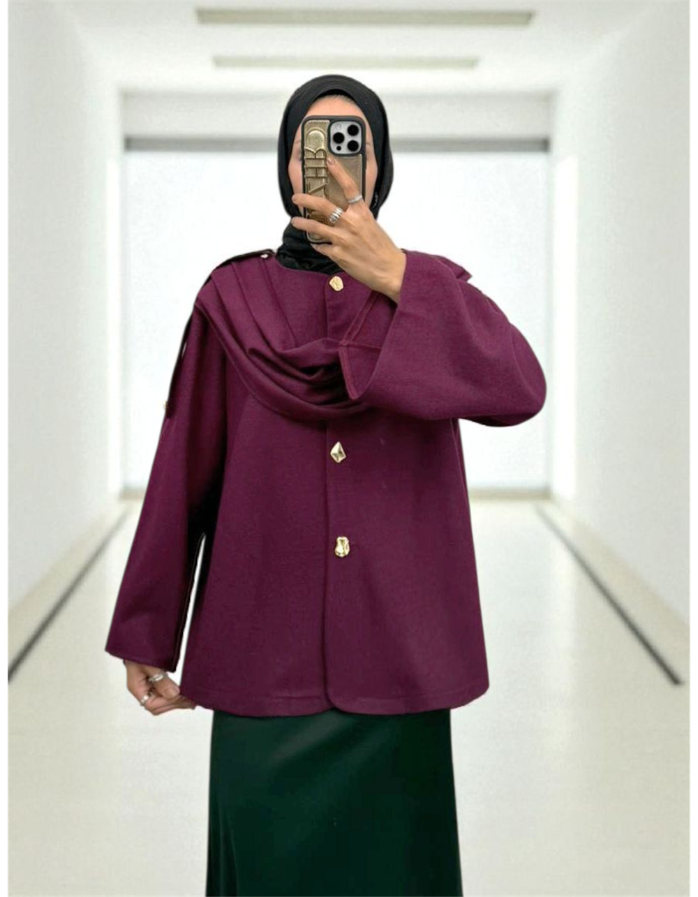 Şal Detaylı Kışlık Keçe Ceket -Mürdüm (307-0025-R09)