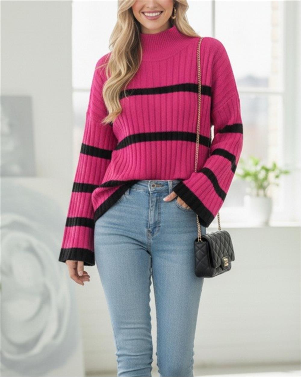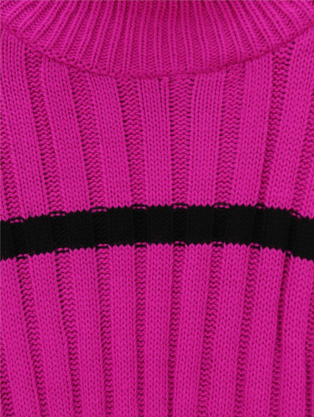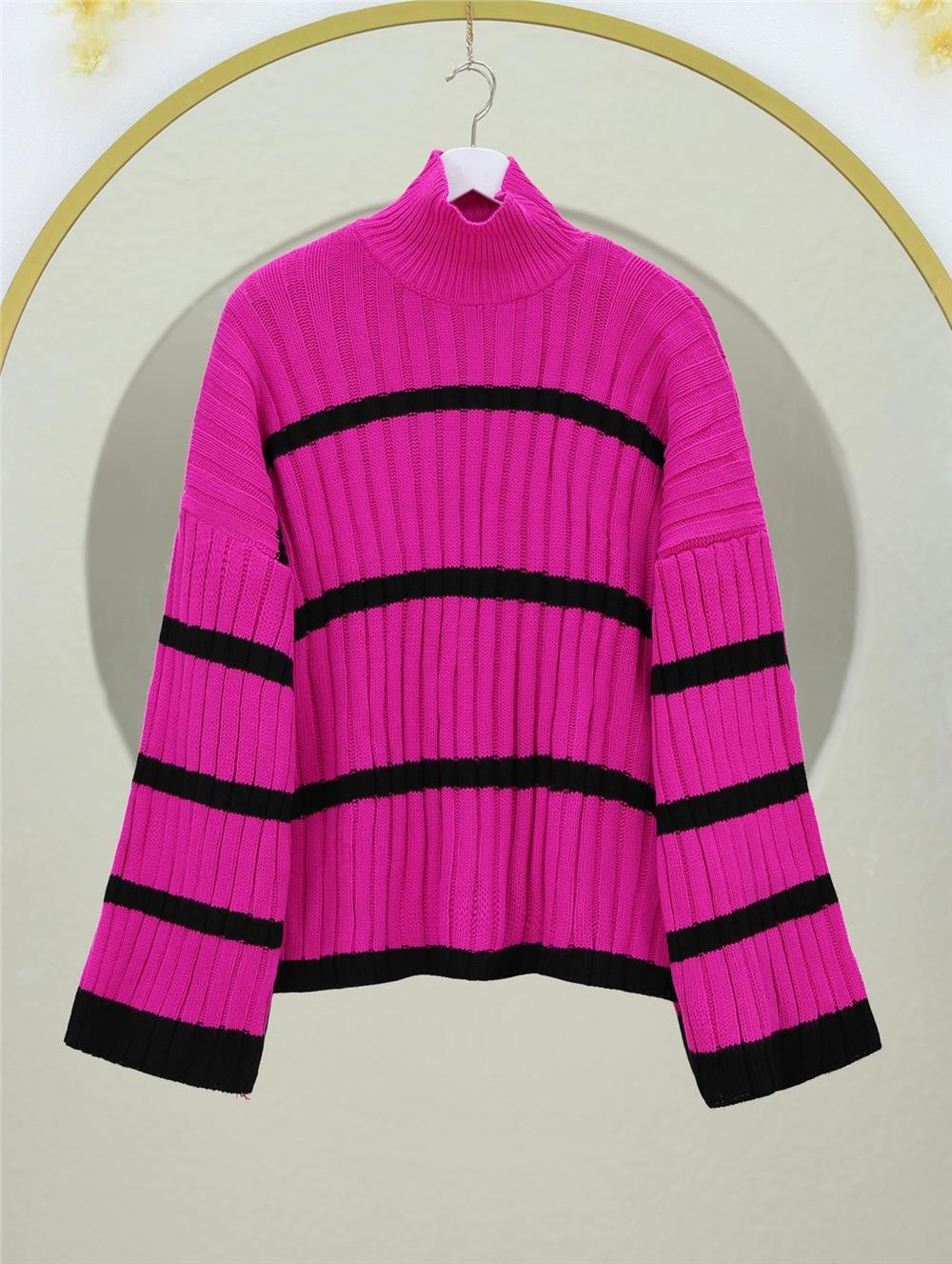 Salaş Kollu Çizgili Triko Kazak -Fuşya (385-2751-R14)