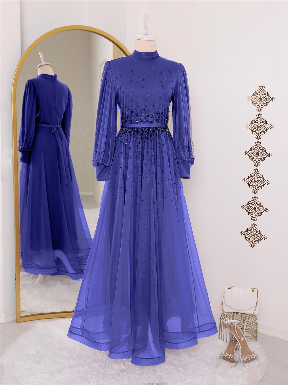 Tasarım Taş Detaylı Kabartma Etekli Tül Abiye -Laci (316-4151-R03)