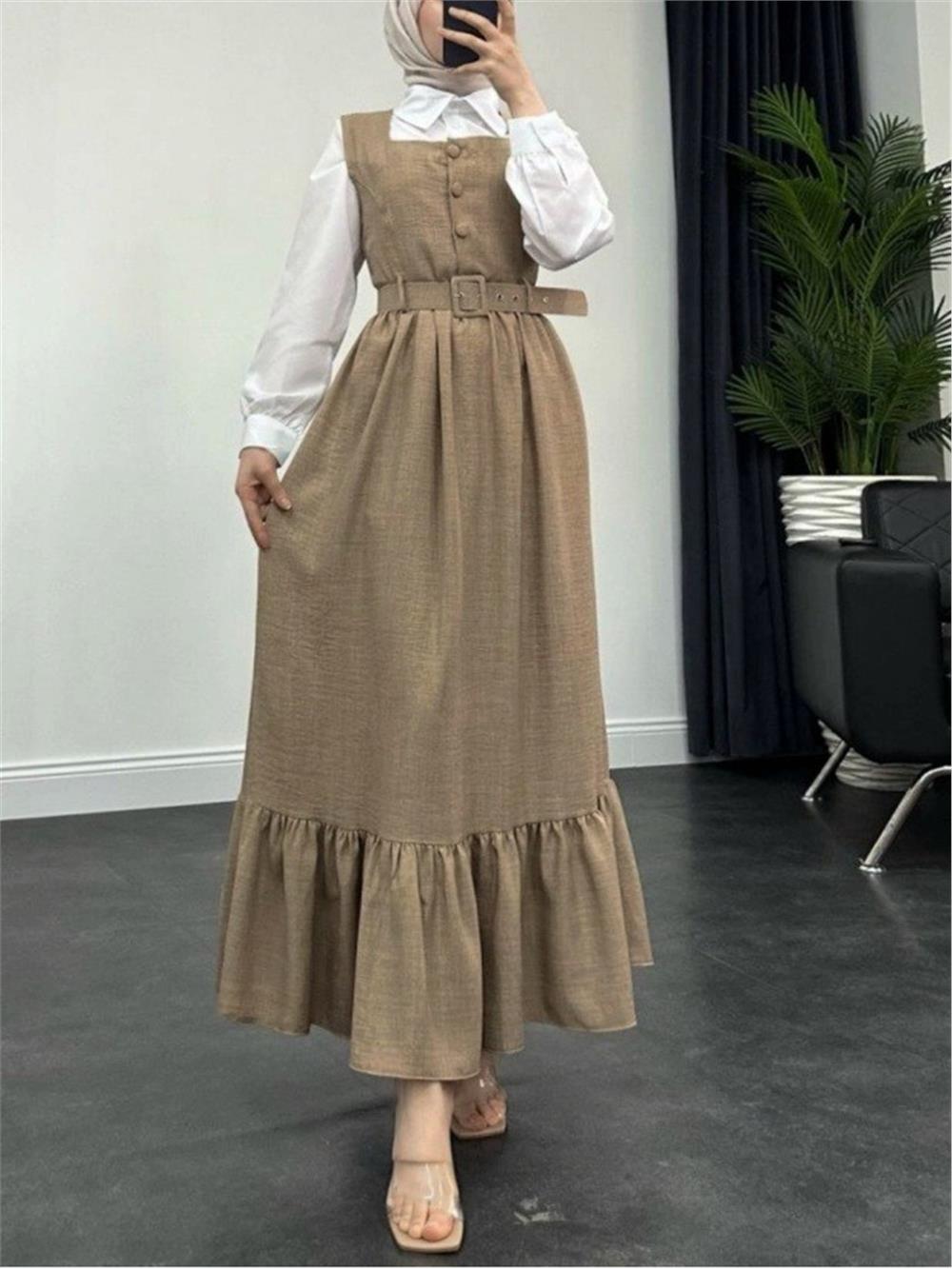 Top Düğmeli Altı Fırfırlı Beli Kemerli Jile Elbise -Vizon (346-3063-R23)