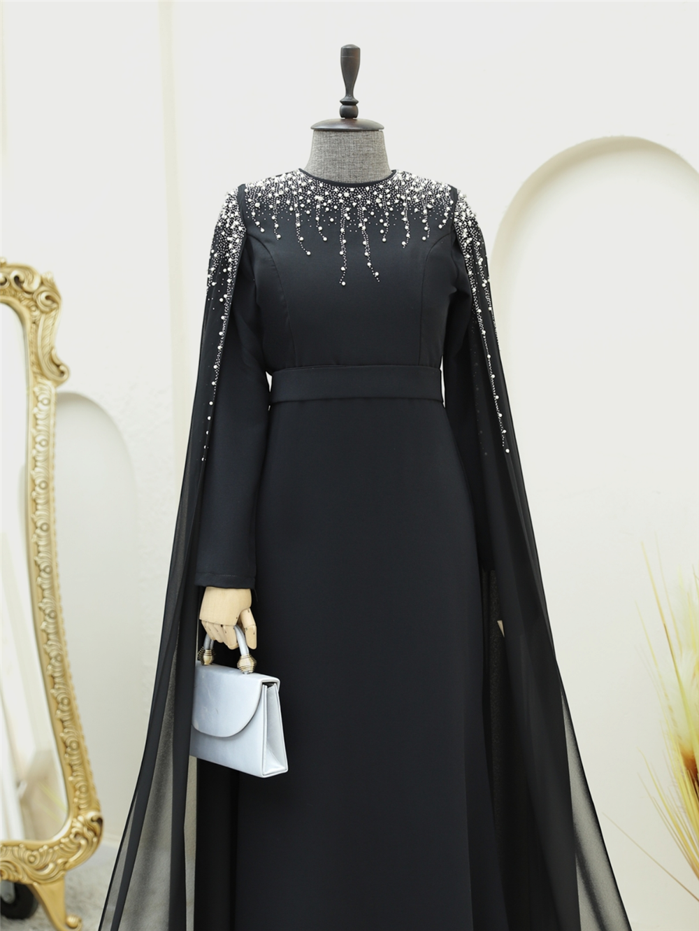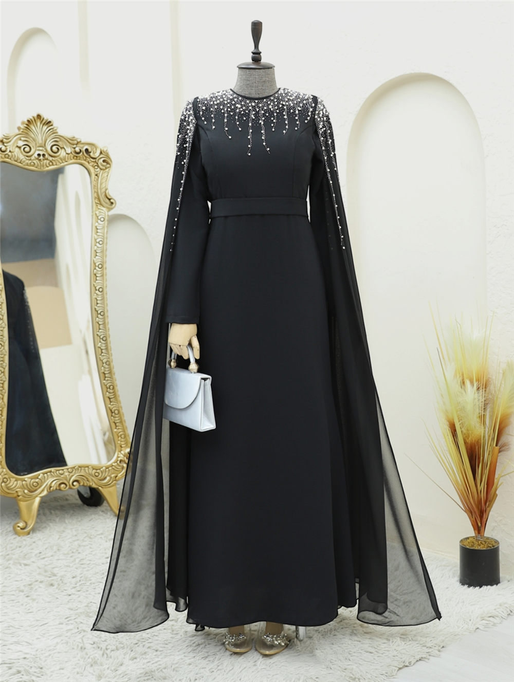 Üstü Taş Ve Boncuklu Pelerinli Abiye -Siyah (316-4637-R01)
