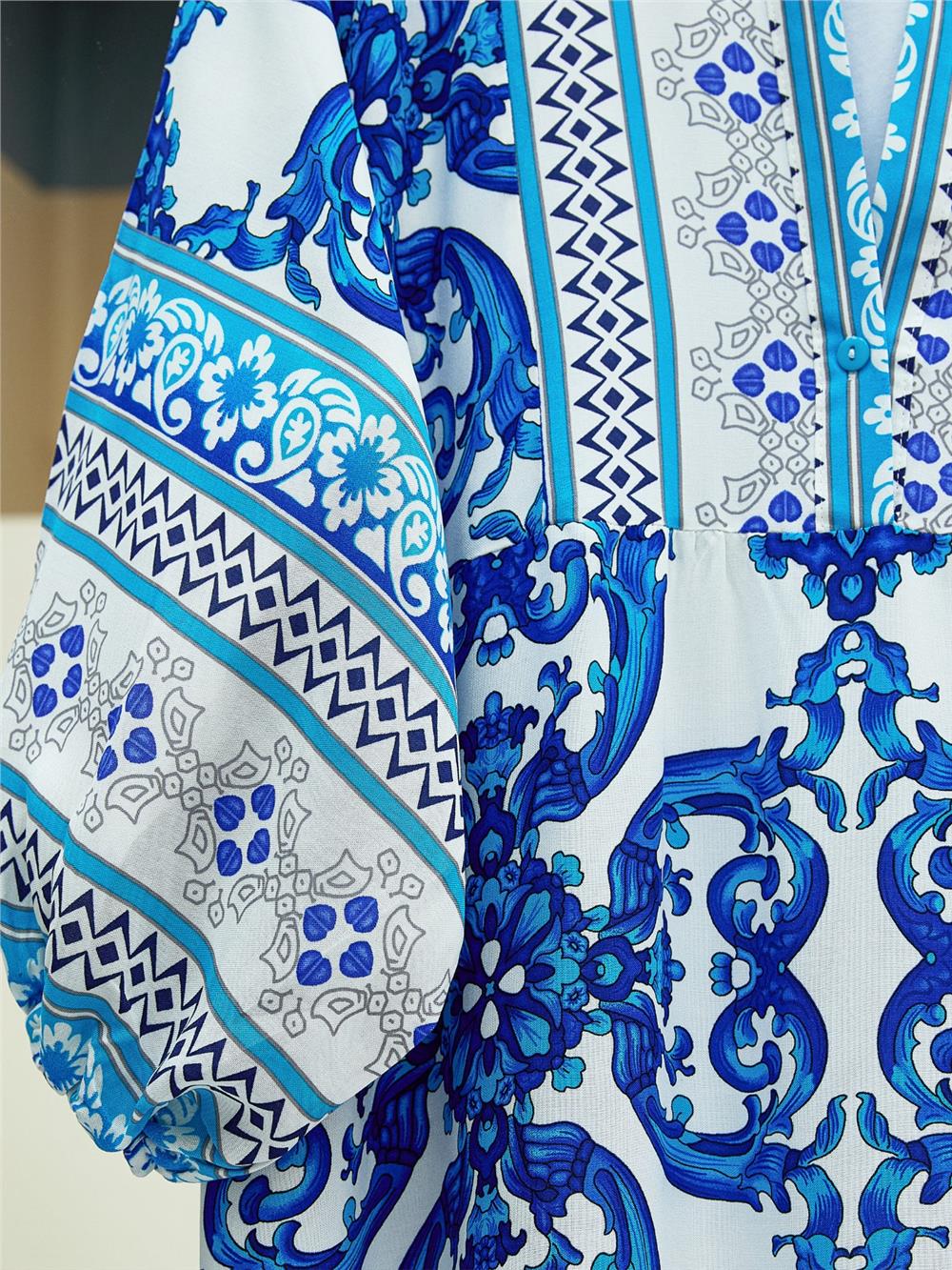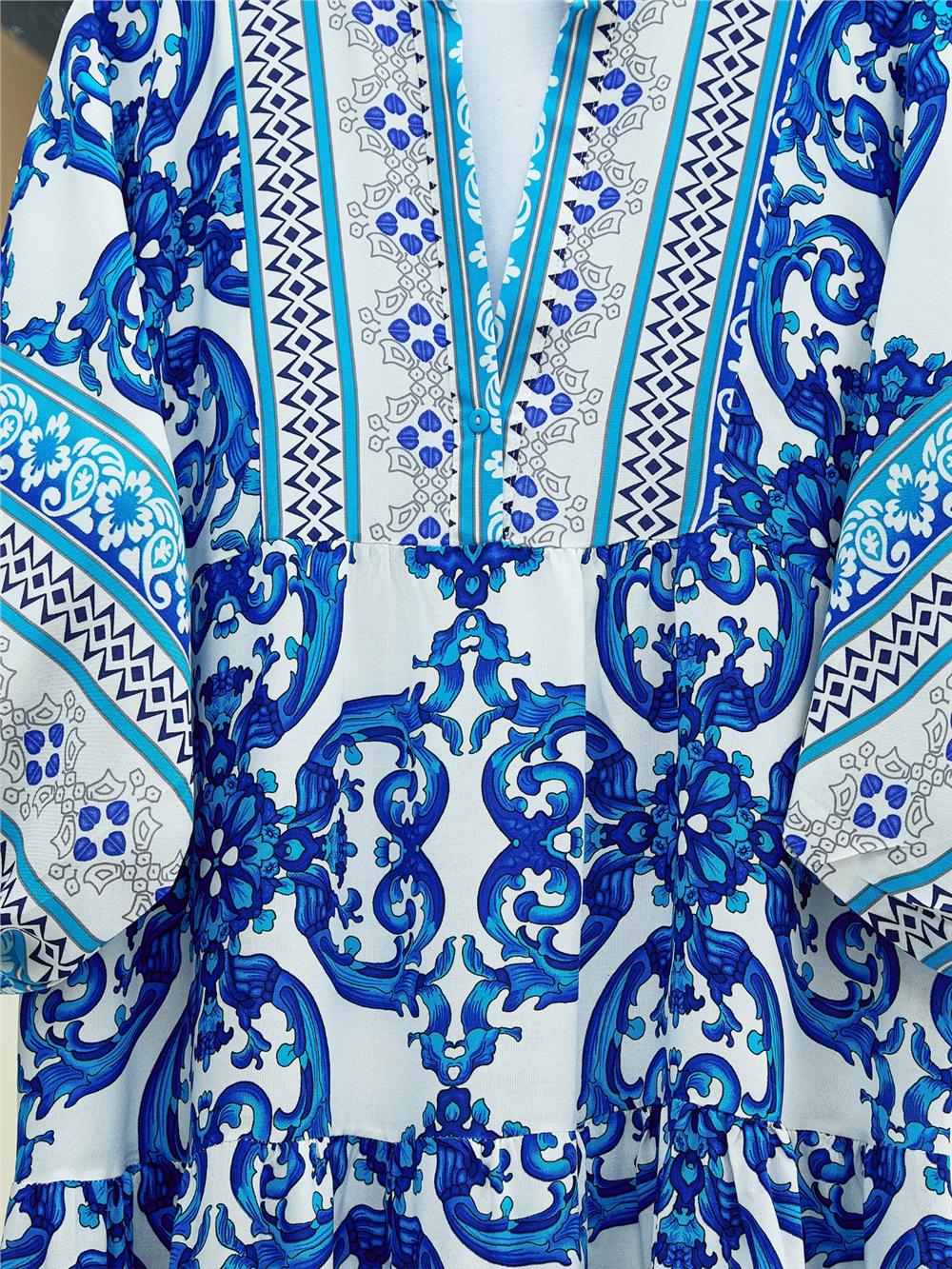 V-Neck Bat Sleeve Piece Viscose Dress - Dark Blue (246-3656-R26)
