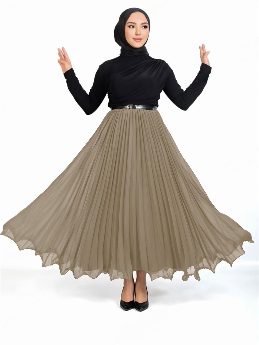 Volanlı Beli Lastikli Şifon Pliseli Etek -Vizon (118-7105-R23)