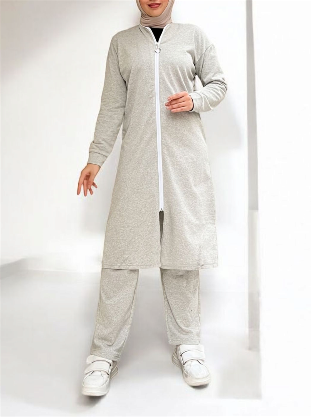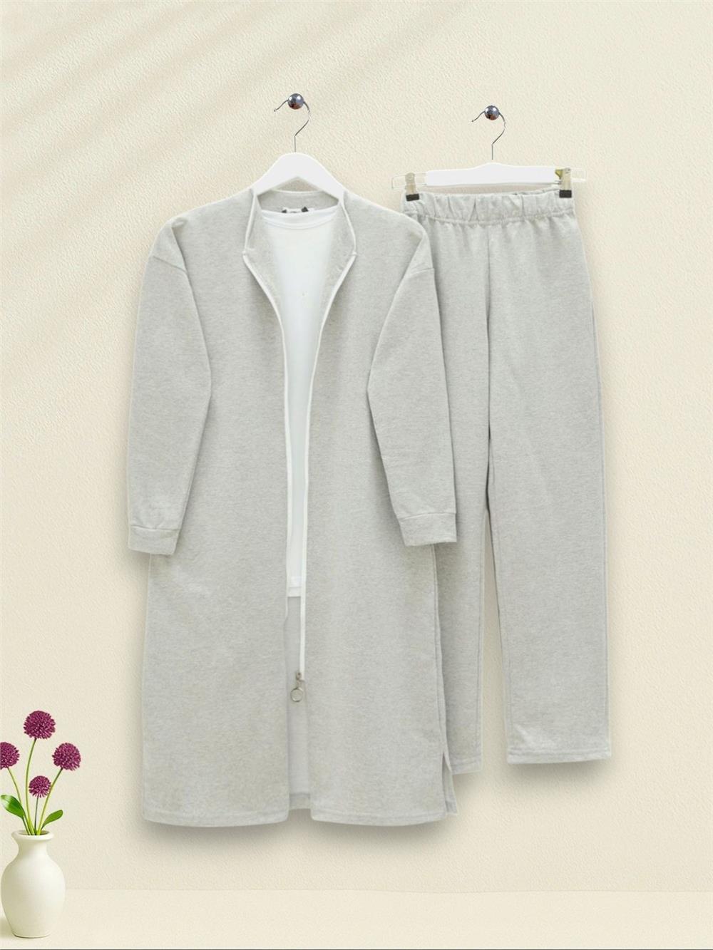 Yakası Biyeli Boydan Fermuarlı İki İp Penye Takım -Açık Gri (332-3044-R41)