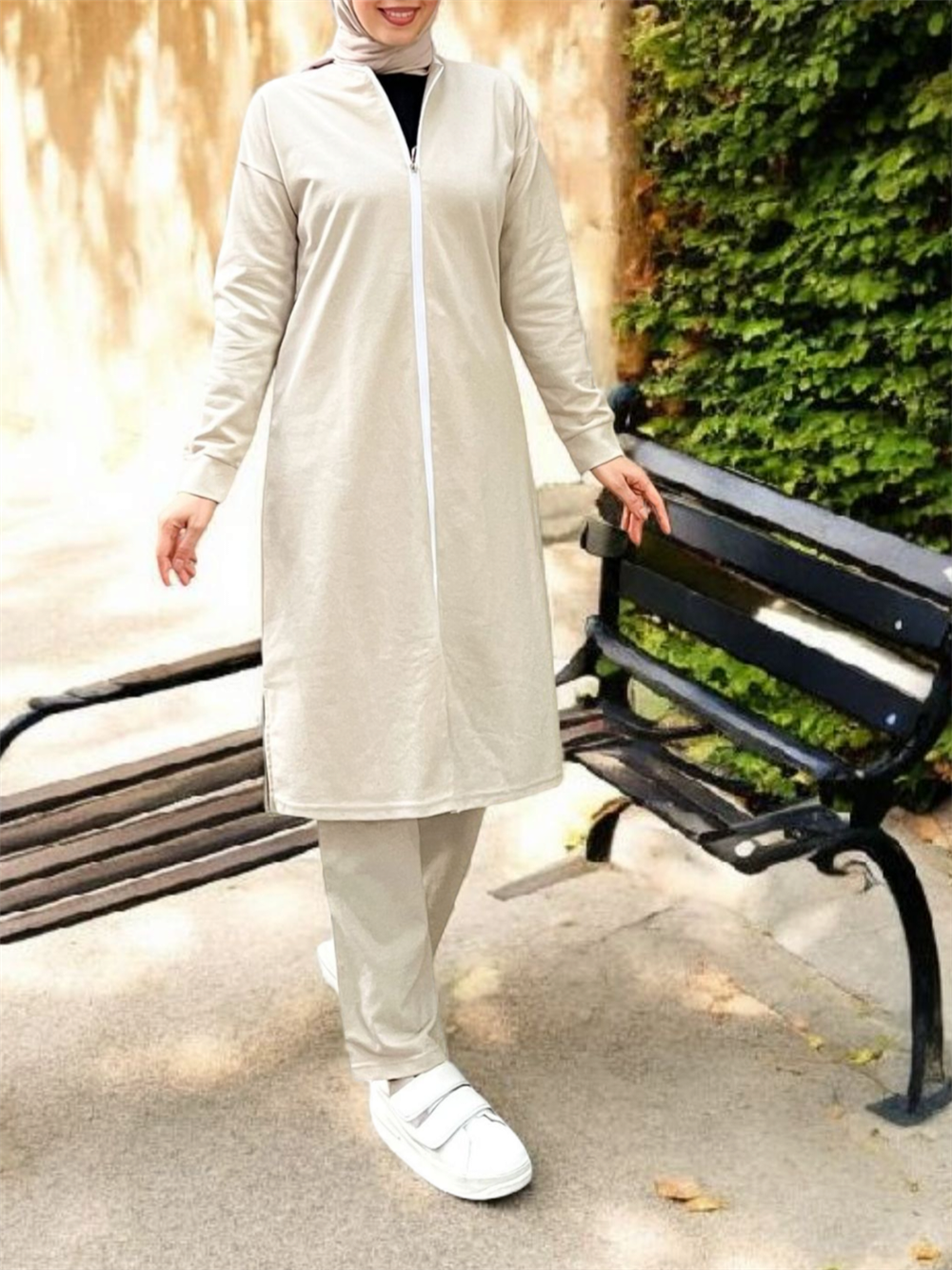 Yakası Biyeli Boydan Fermuarlı İki İp Penye Takım -Bej (332-3044-R56)