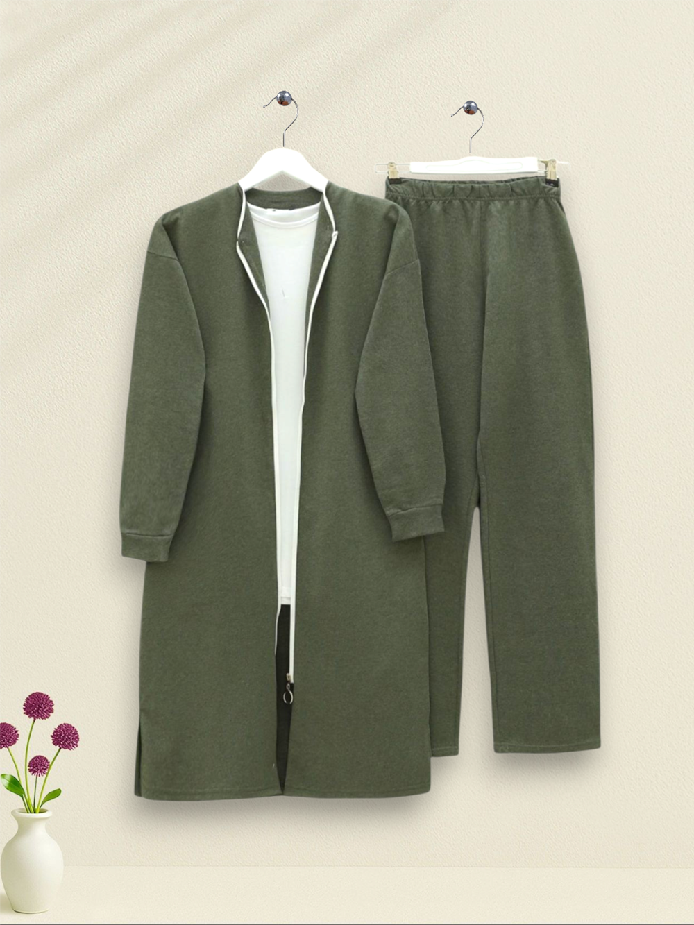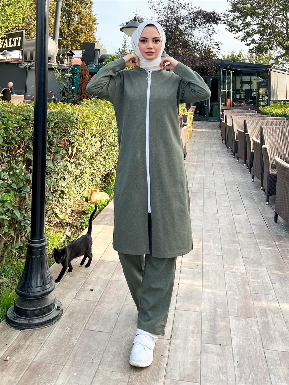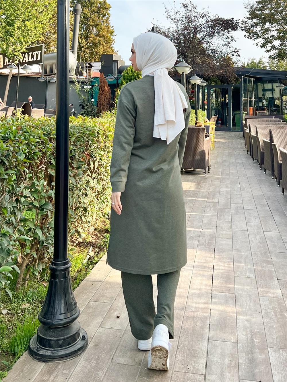 Yakası Biyeli Boydan Fermuarlı İki İp Penye Takım -Haki (332-3044-R05)