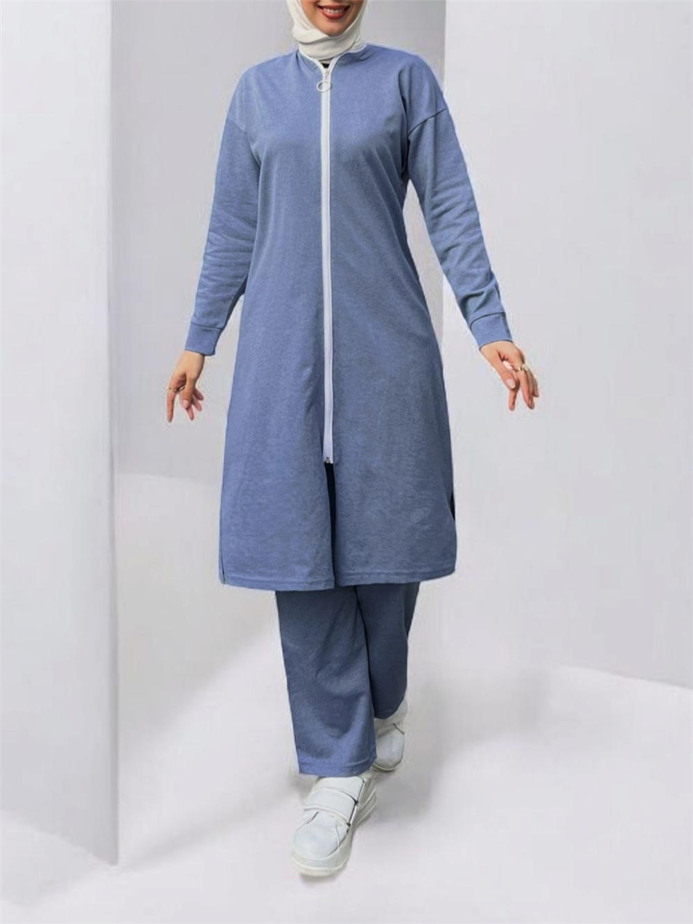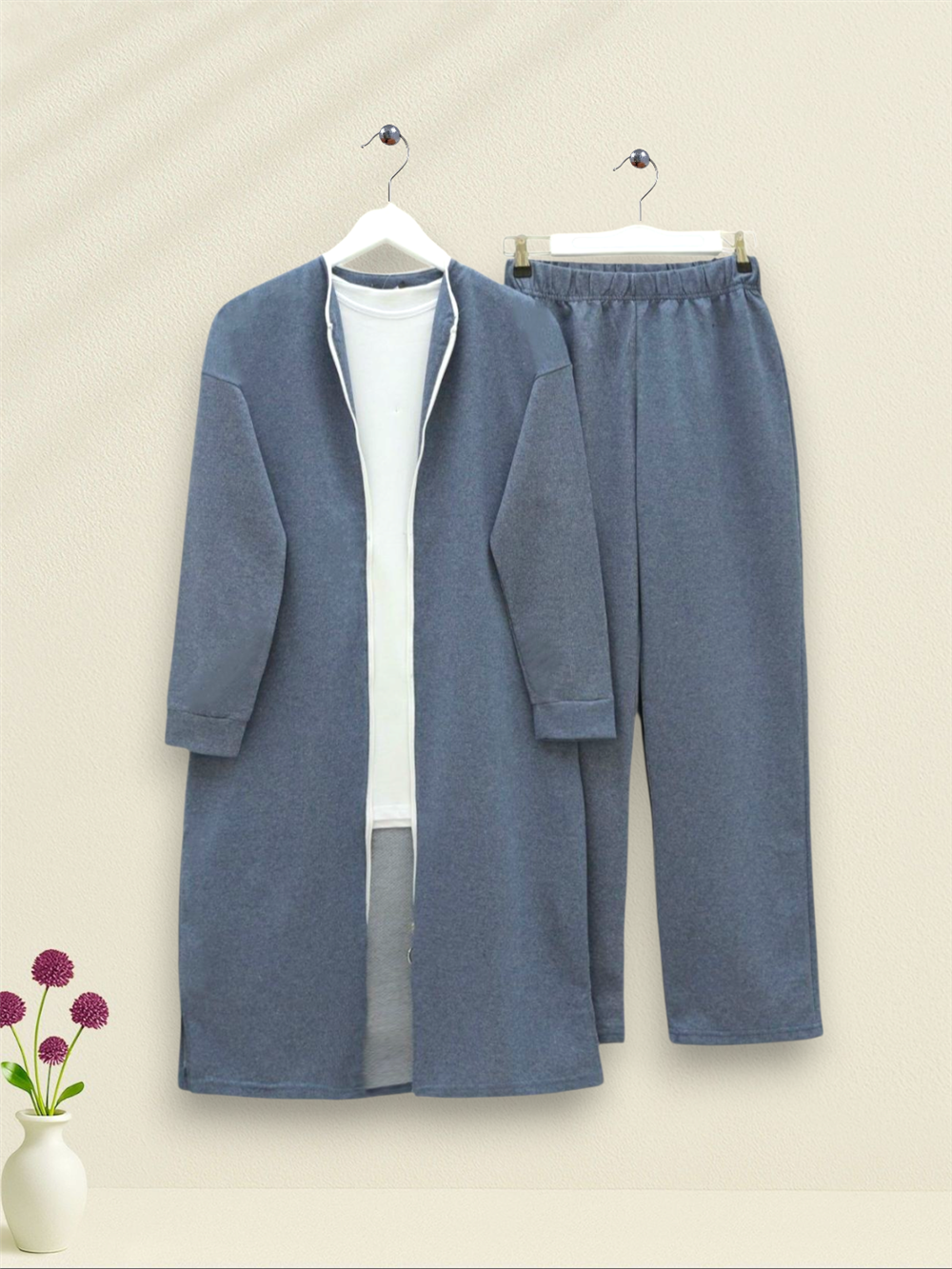 Yakası Biyeli Boydan Fermuarlı İki İp Penye Takım -İndigo (332-3044-R21)