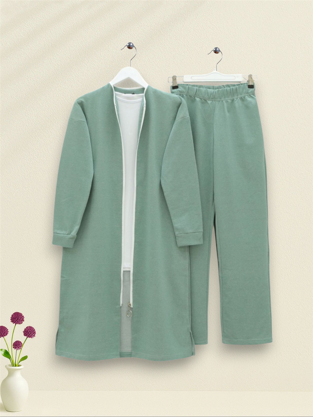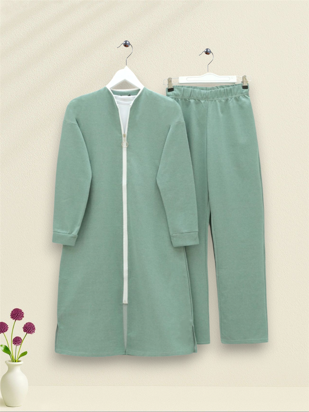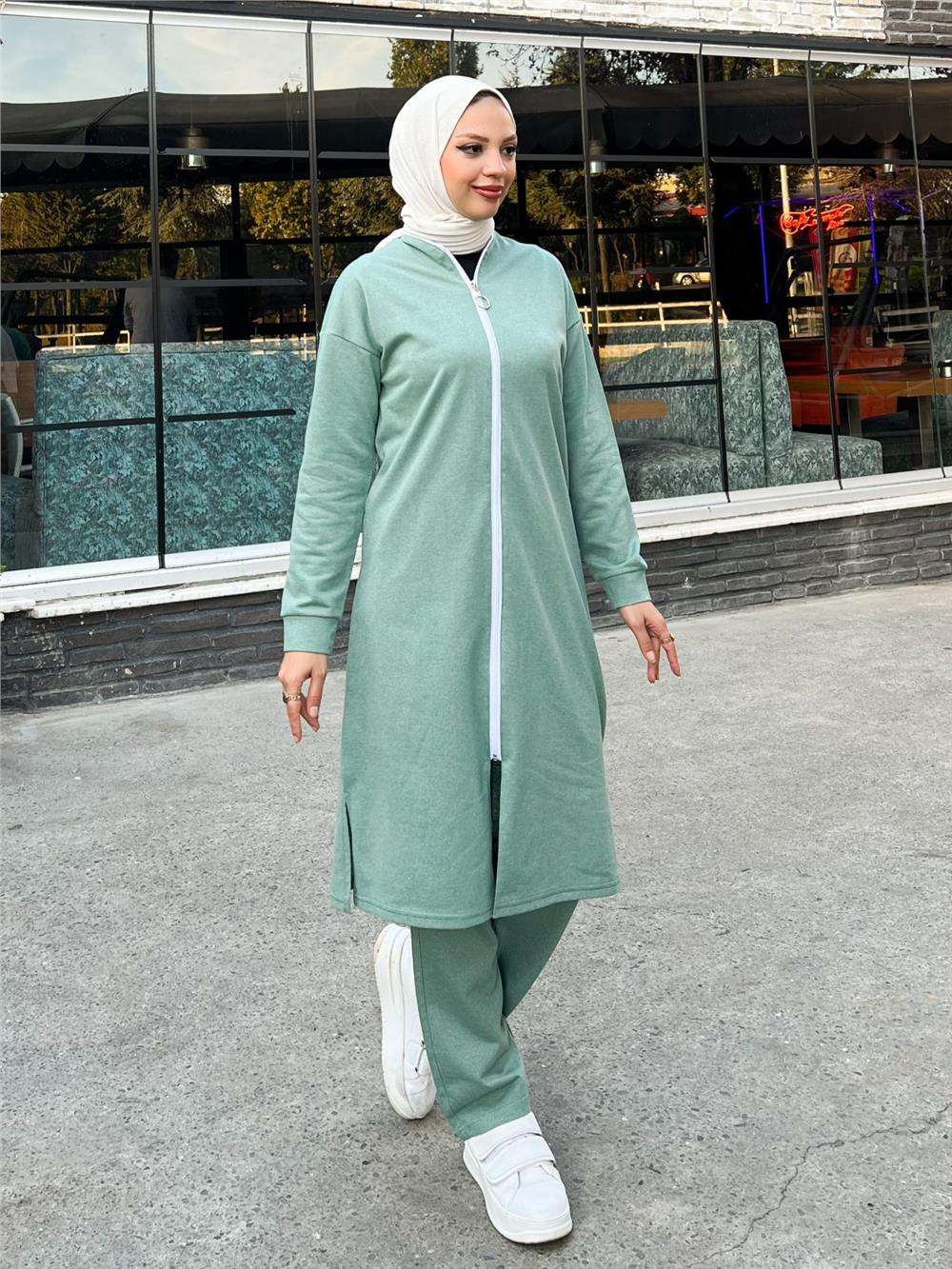 Yakası Biyeli Boydan Fermuarlı İki İp Penye Takım -Mint (332-3044-R24)