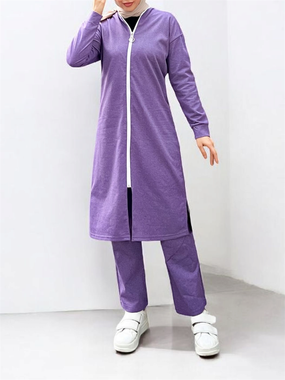 Yakası Biyeli Boydan Fermuarlı İki İp Penye Takım -Mor (332-3044-R34)