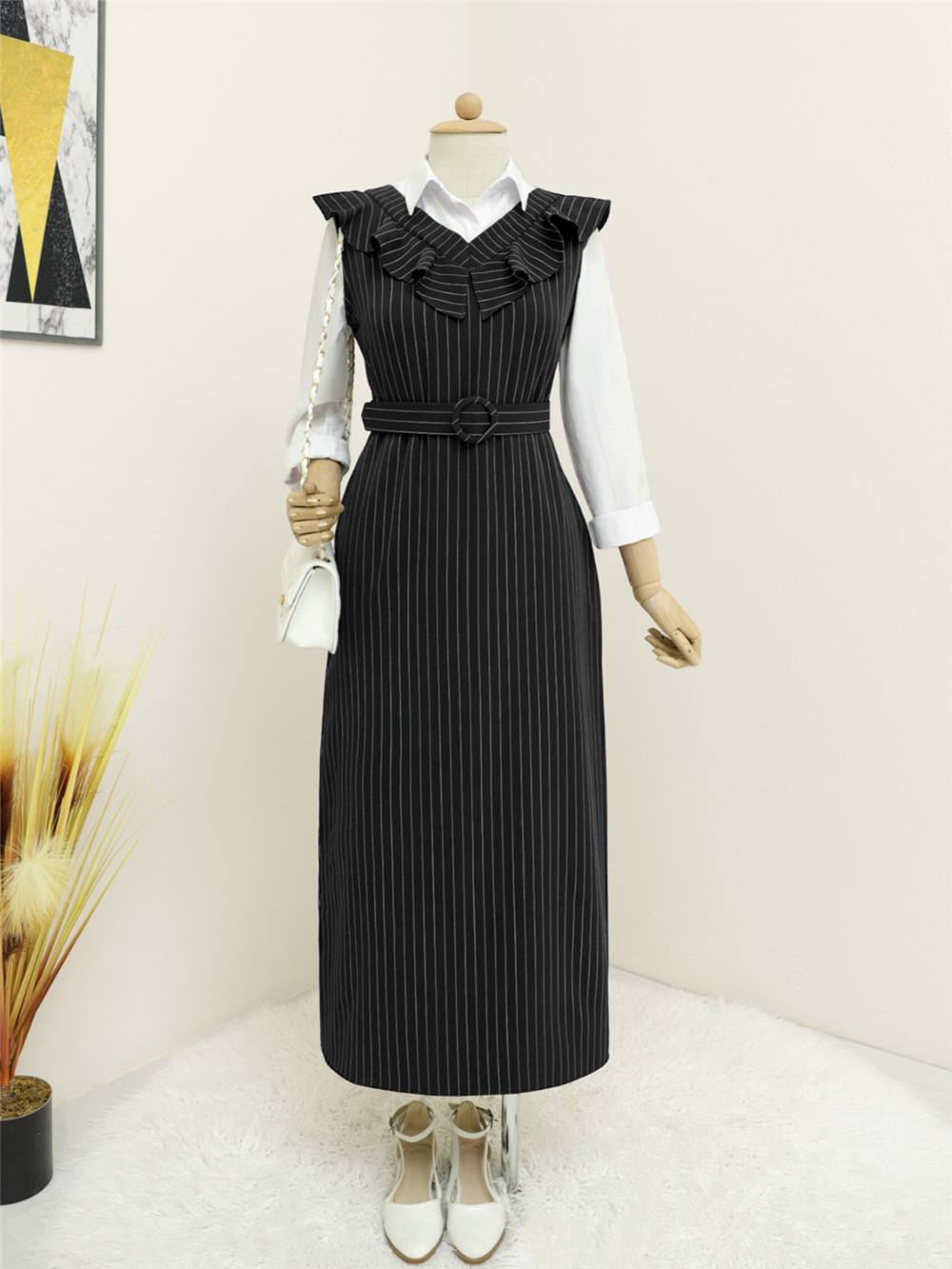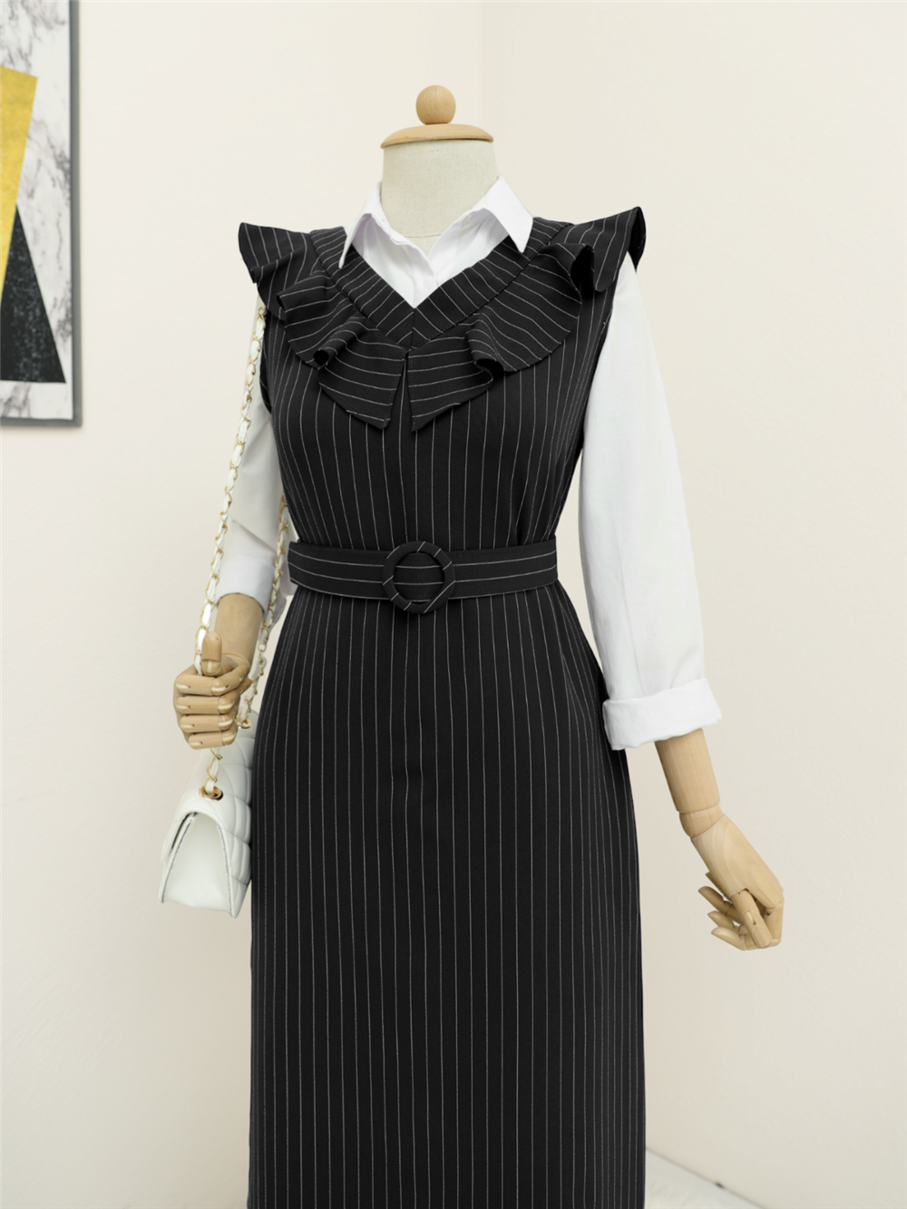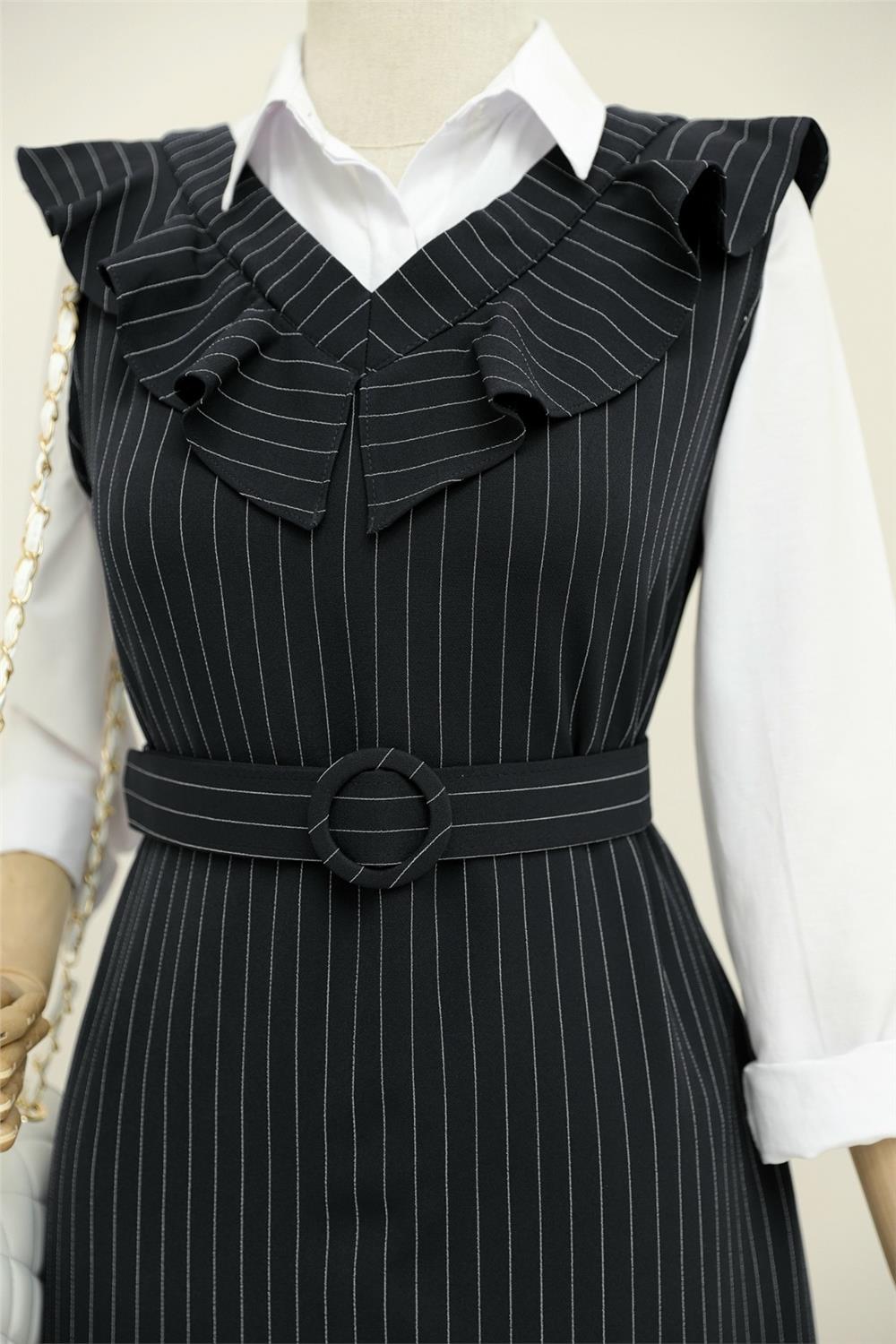 Striped Belted Gilet Dress with Frilly Collar - Black (111-60812-R01)