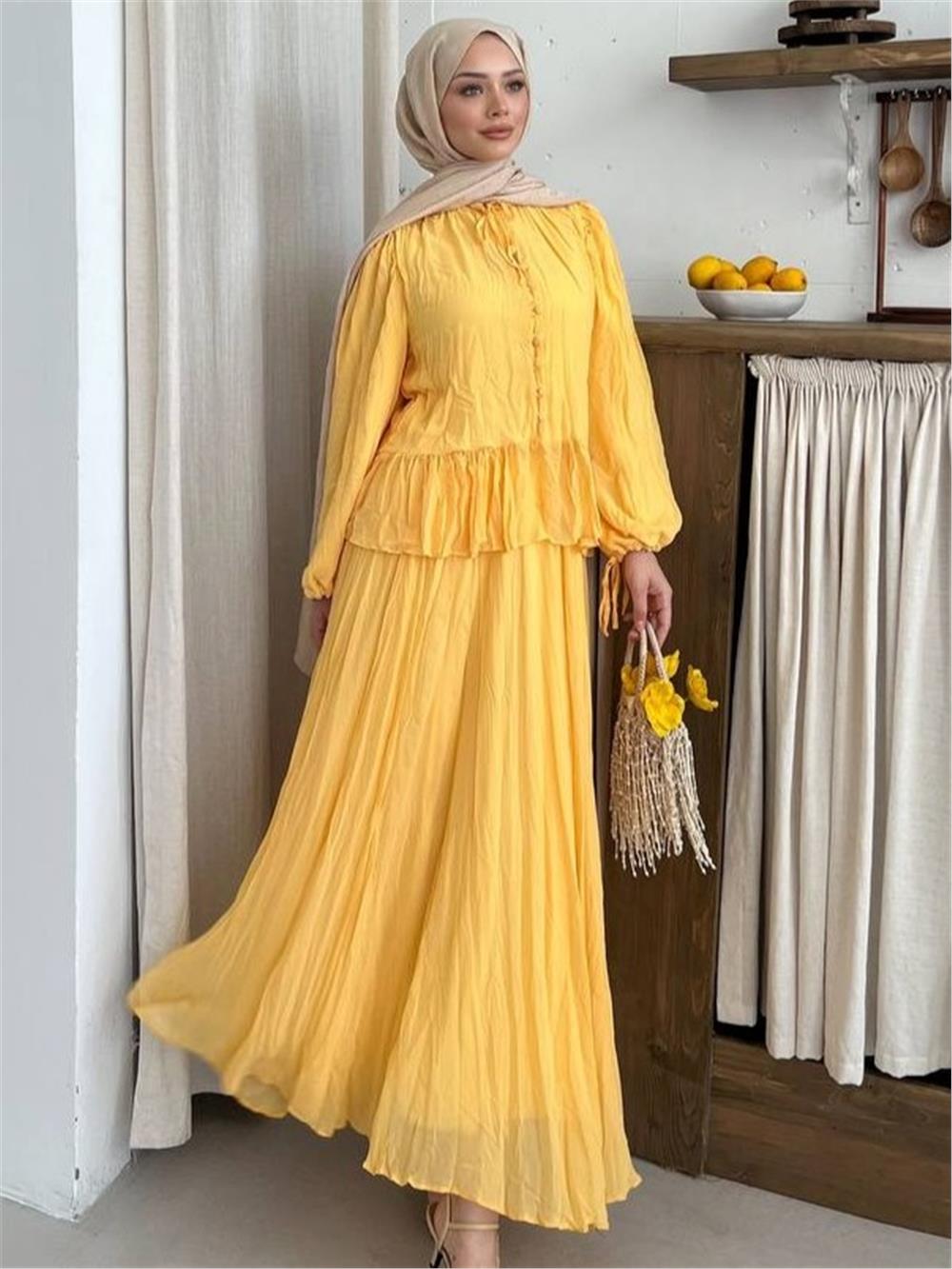 Yakası Fırfırlı Düğmeli Şifon Kraş Etekli Takım -Sarı (114-760-R22)