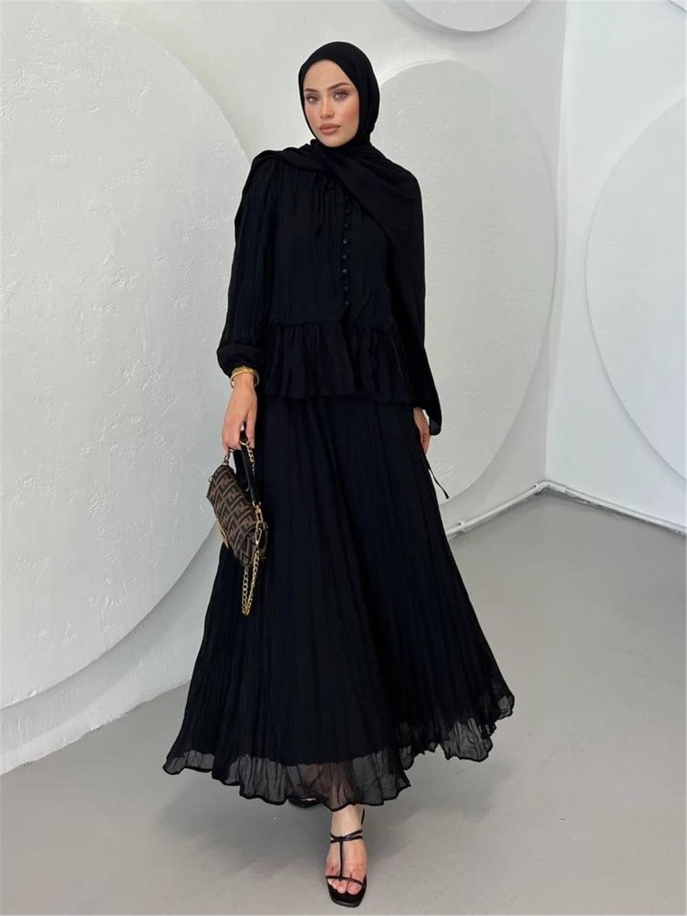 Yakası Fırfırlı Düğmeli Şifon Kraş Etekli Takım -Siyah (114-760-R01)