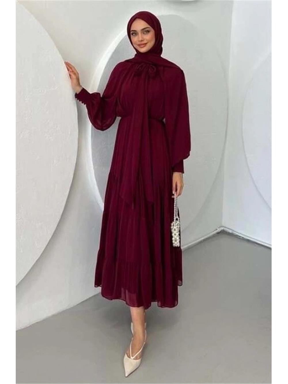 Yakası Fular Detaylı Eteği Parçalı Şifon Elbise -Bordo (114-5731-R04)