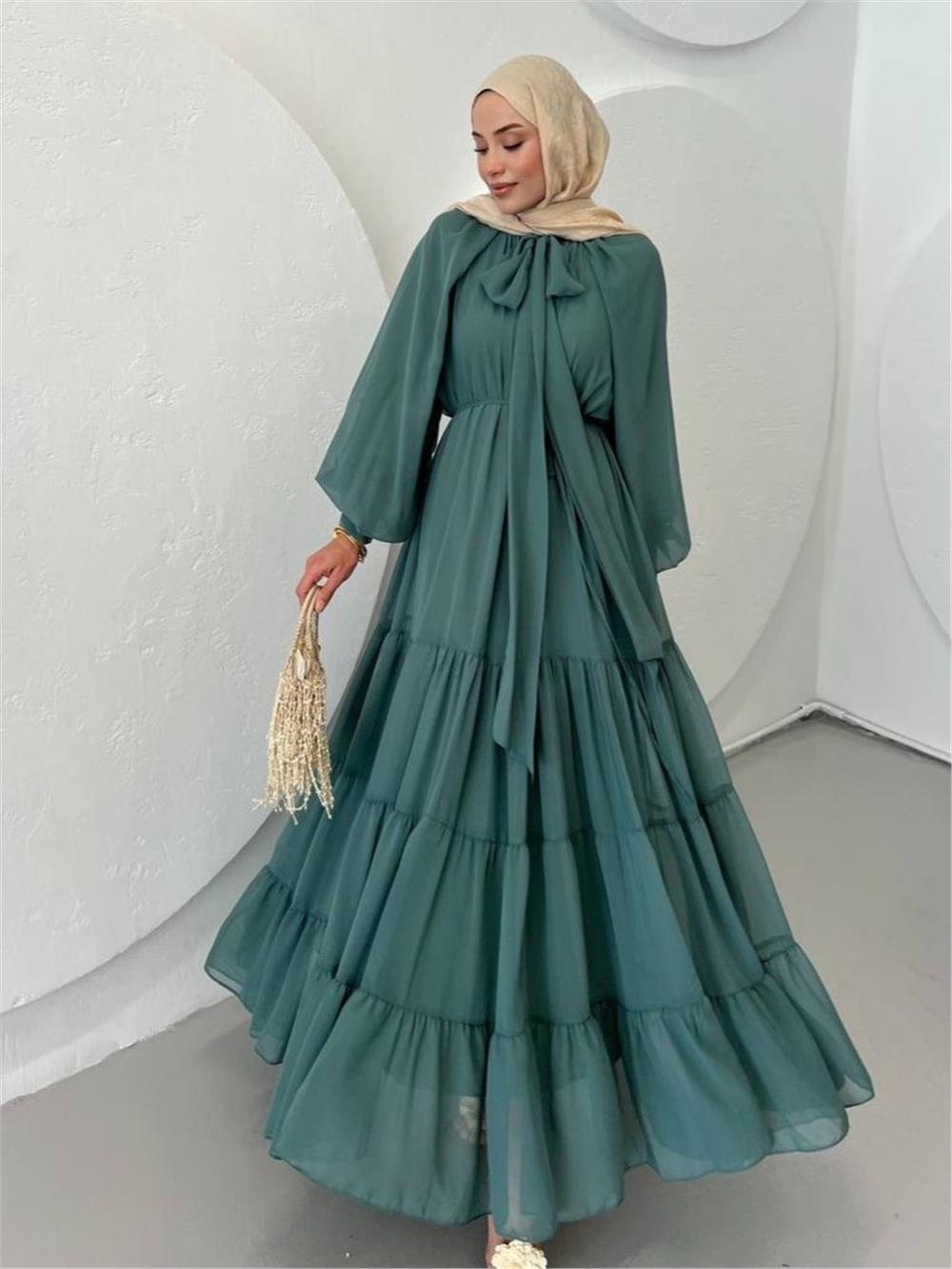 Yakası Fular Detaylı Eteği Parçalı Şifon Elbise -Mint (114-5731-R24)