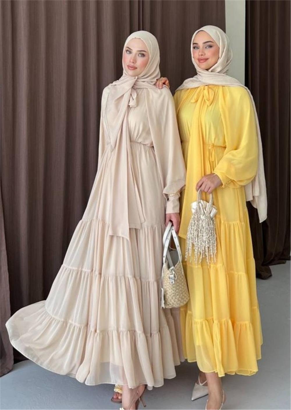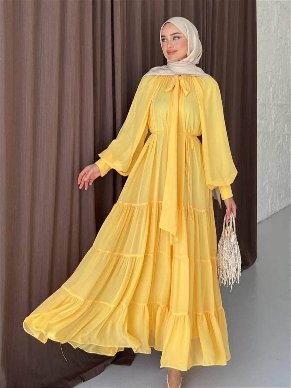 Yakası Fular Detaylı Eteği Parçalı Şifon Elbise -Sarı (114-5731-R22)