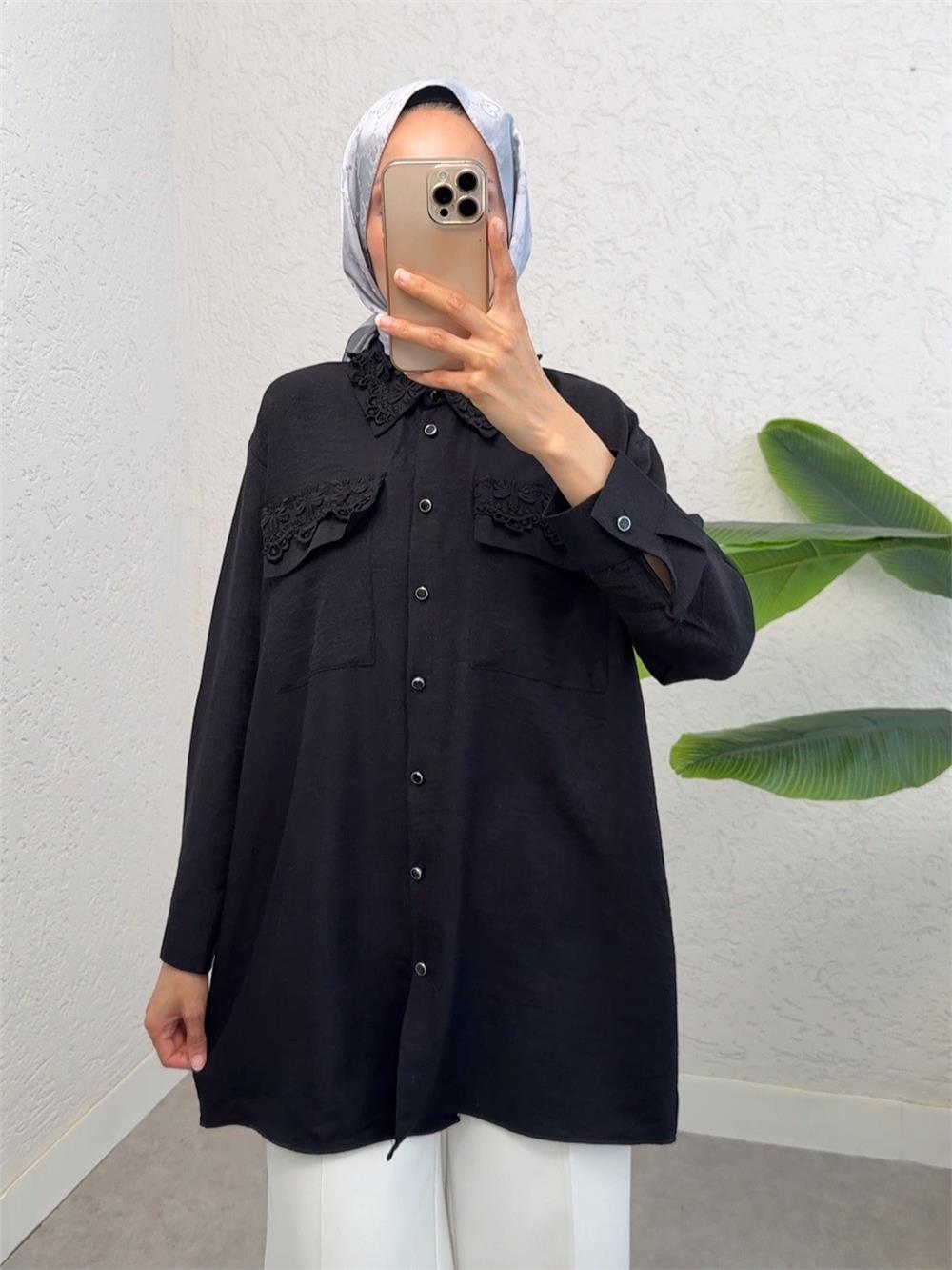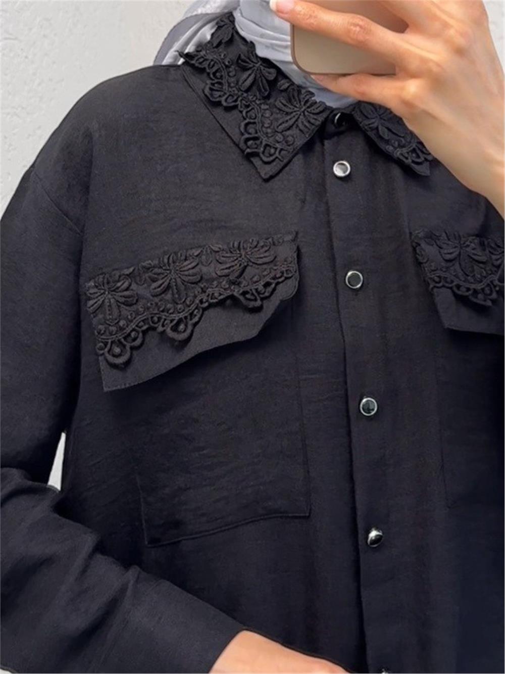 Yakası Ve Cepleri Dantel Detaylı Gömlek -Siyah (238-2553-R01)