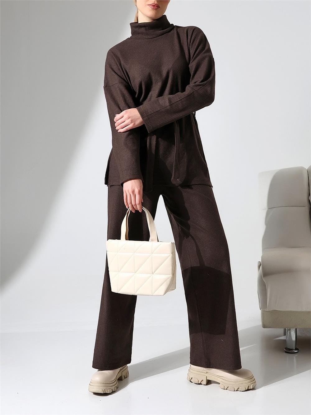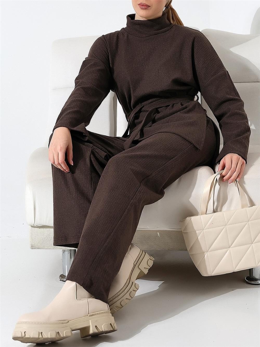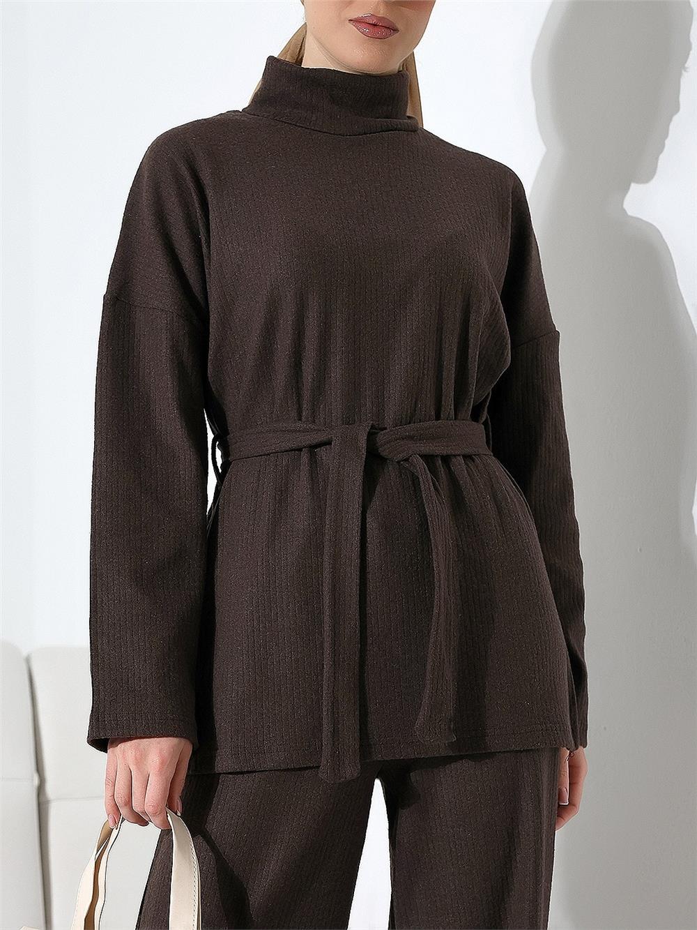 Yarım Boğazlı Kuşaklı Fitilli Takım -Kahve (253-12963-R15)
