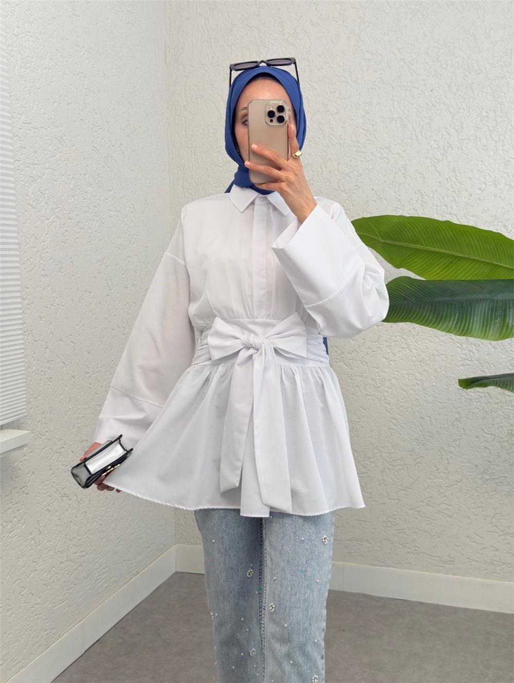 Yarım Düğmeli Beli Bağlamalı Yanı Fermuarlı Tunik -Beyaz (120-1613-R02)
