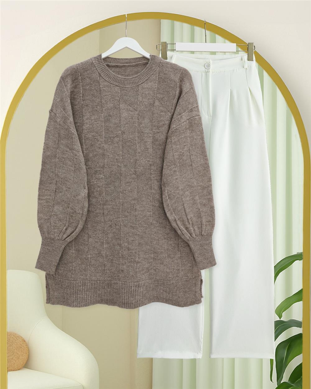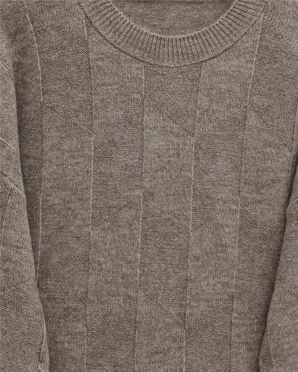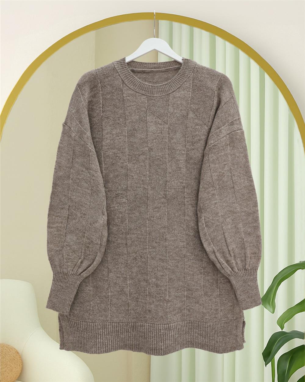 Yuvarlak Yaka Salaş Desenli Triko Kazak -Toprak (295-4514-R55)