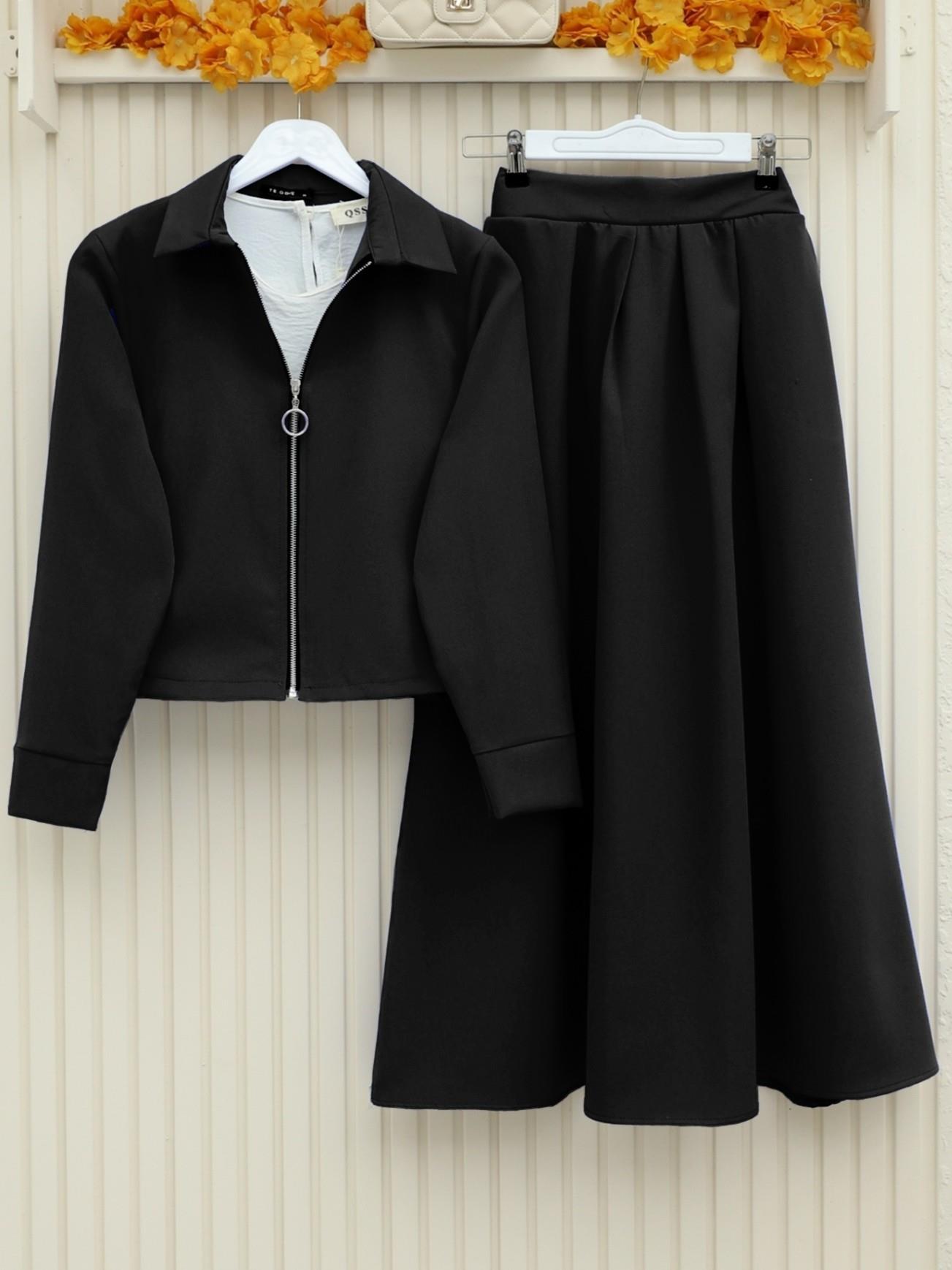 Fermuarlı, pliseli, etekli takım; şıklığı ve zarafeti bir araya getiren modern bir tasarımdır. Fermuar detayları, takıma pratiklik katarken, pliseli etekler hareketli ve şık bir görünüm sağlar. Hem rahat hem de şık olan bu takım, farklı kombinlerle günlük kullanımda ya da özel davetlerde rahatlıkla tercih edilebilir. Vücuda oturan yapısı ve şık detaylarıyla her kadının gardırobunda yer alması gereken bir parçadır.