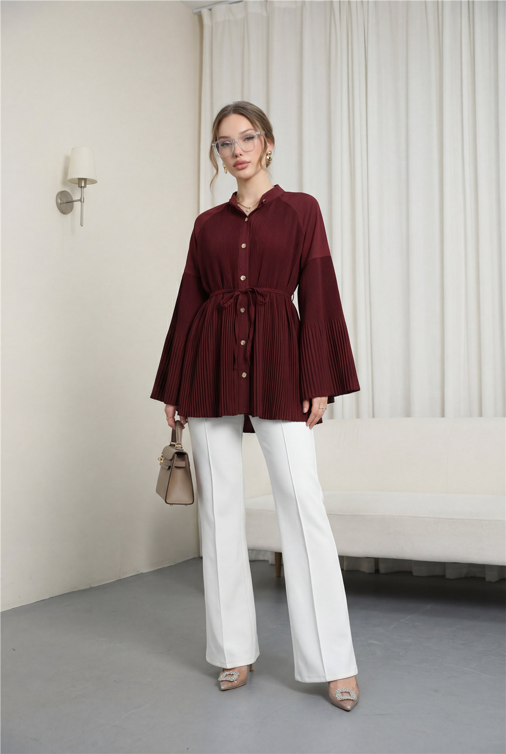 Gold Düğmeli Önü Ve Kolları Pliseli Bağcıklı Gömlek -Bordo (433-10072-R04)