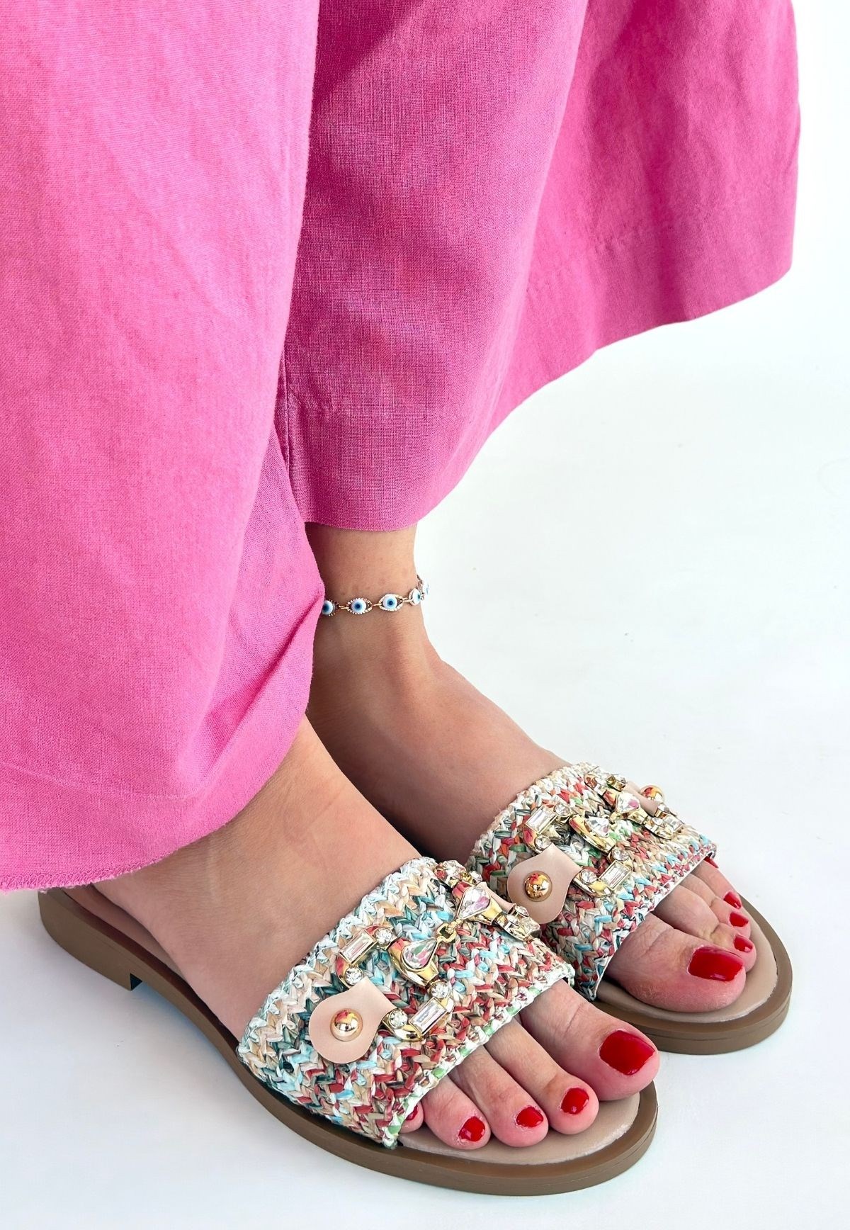 Gonne Hasır Dokuma Terlik -Renkli modeli, kadın terlik kategorisinde, renkli rengiyle günlük ve özel gün kombinlerinde kullanılabilecek şık bir seçenektir.