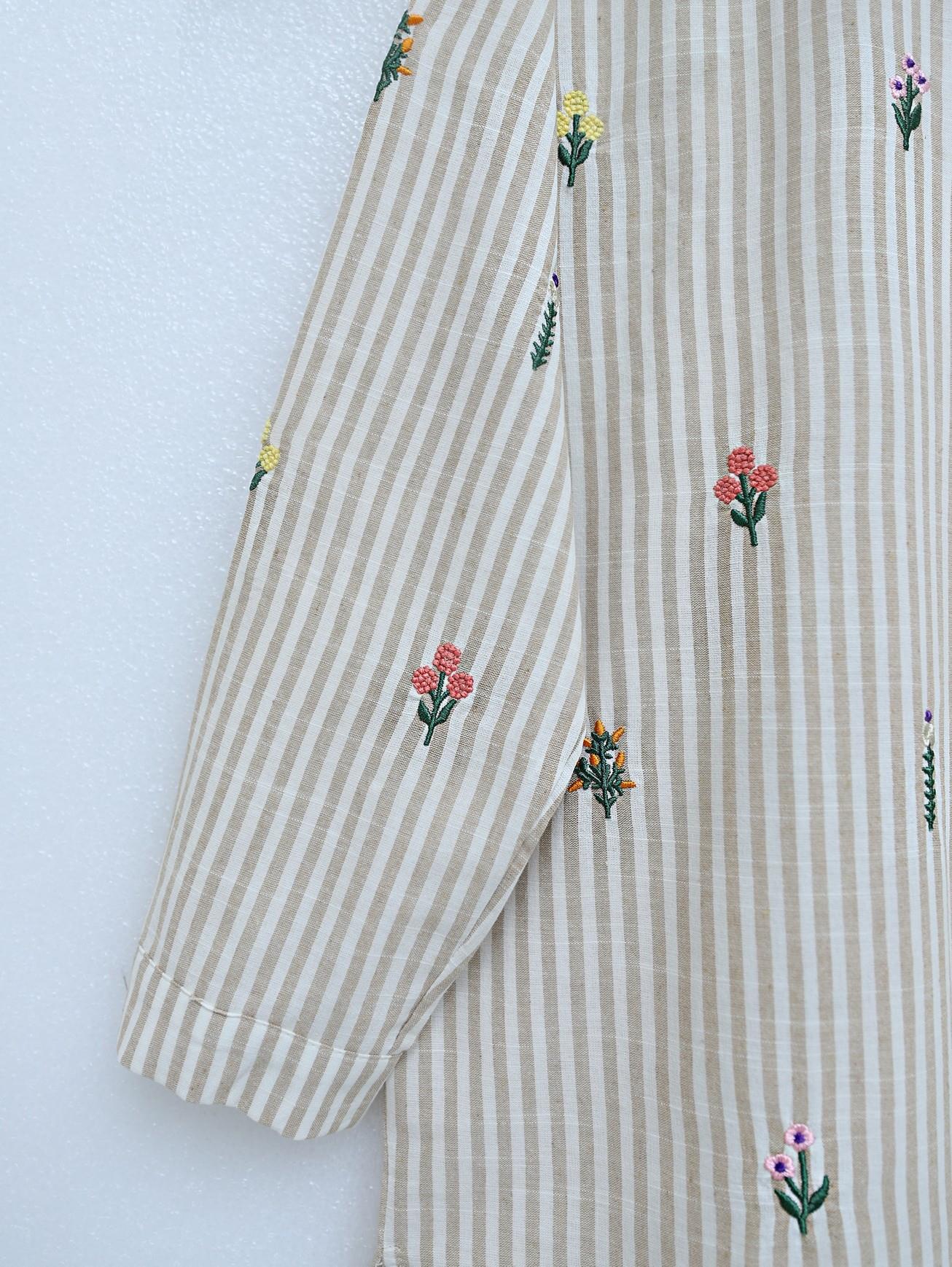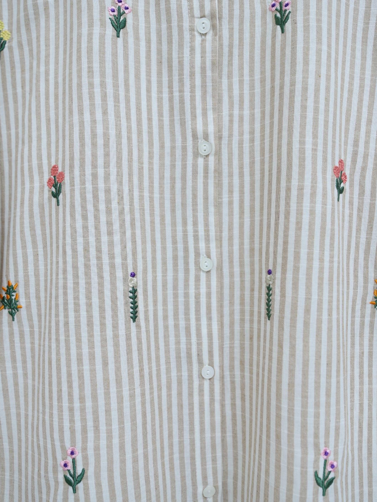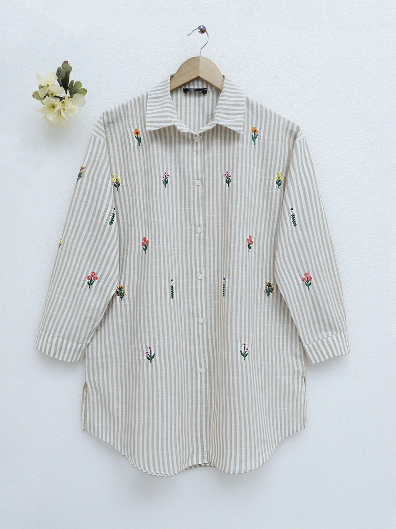 Gül Nakışlı Çizgili Keten Gömlek -Vizon (253-12895-R23)