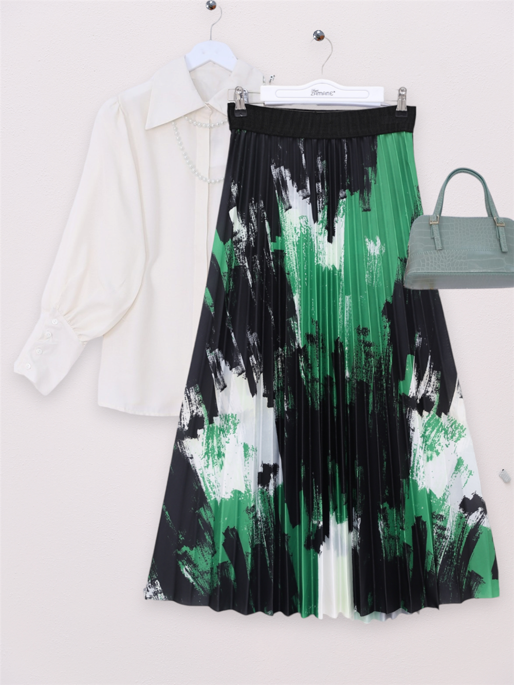 Karışık Desenli Beli Lastikli Pliseli Etek -Yeşil (123-1048-R35)