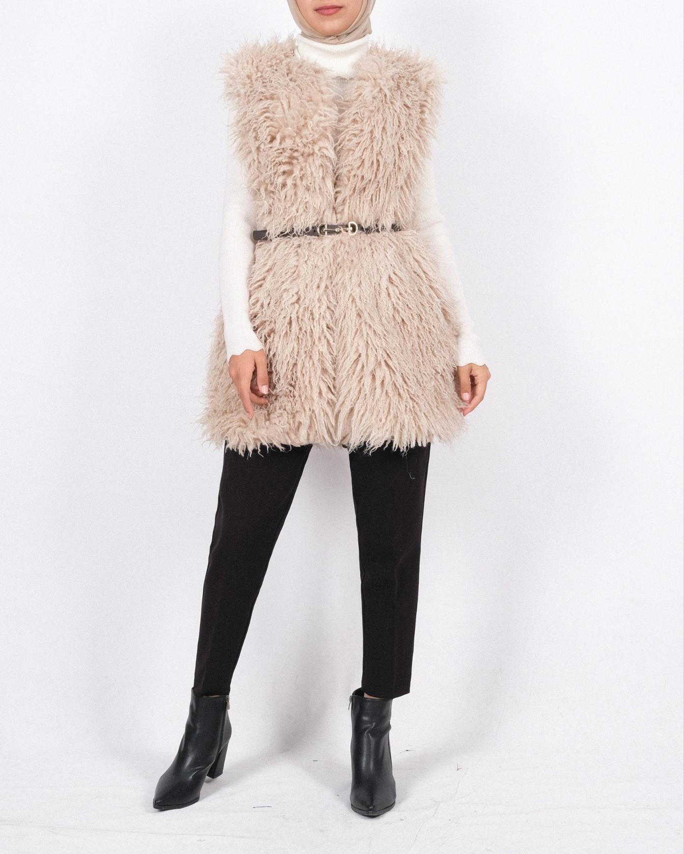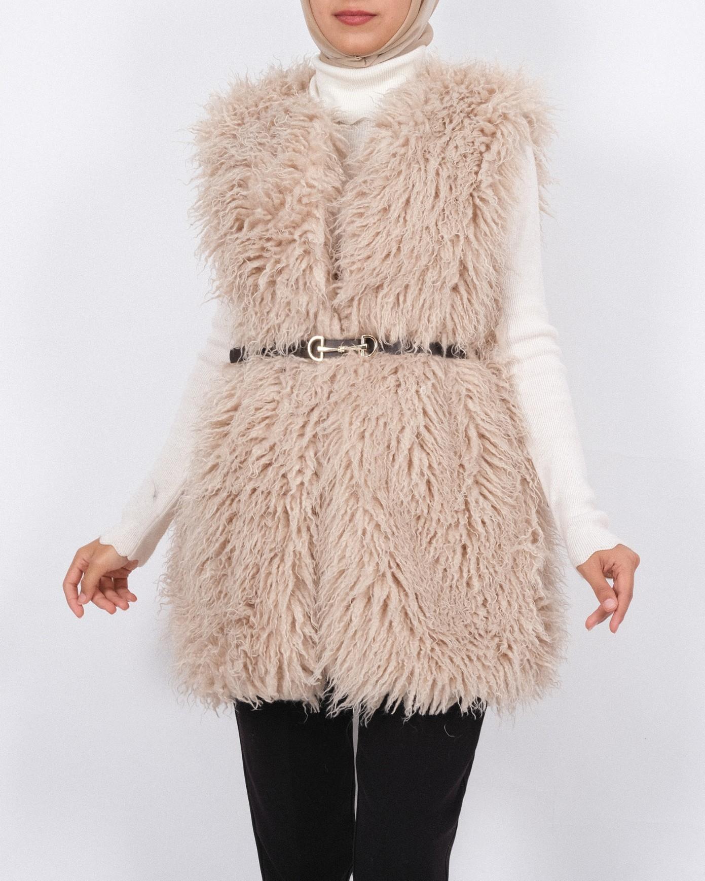 Kemerli Yan Cepli Kürklü Astarlı Yelek -Açık Vizon (111-70198-R51)