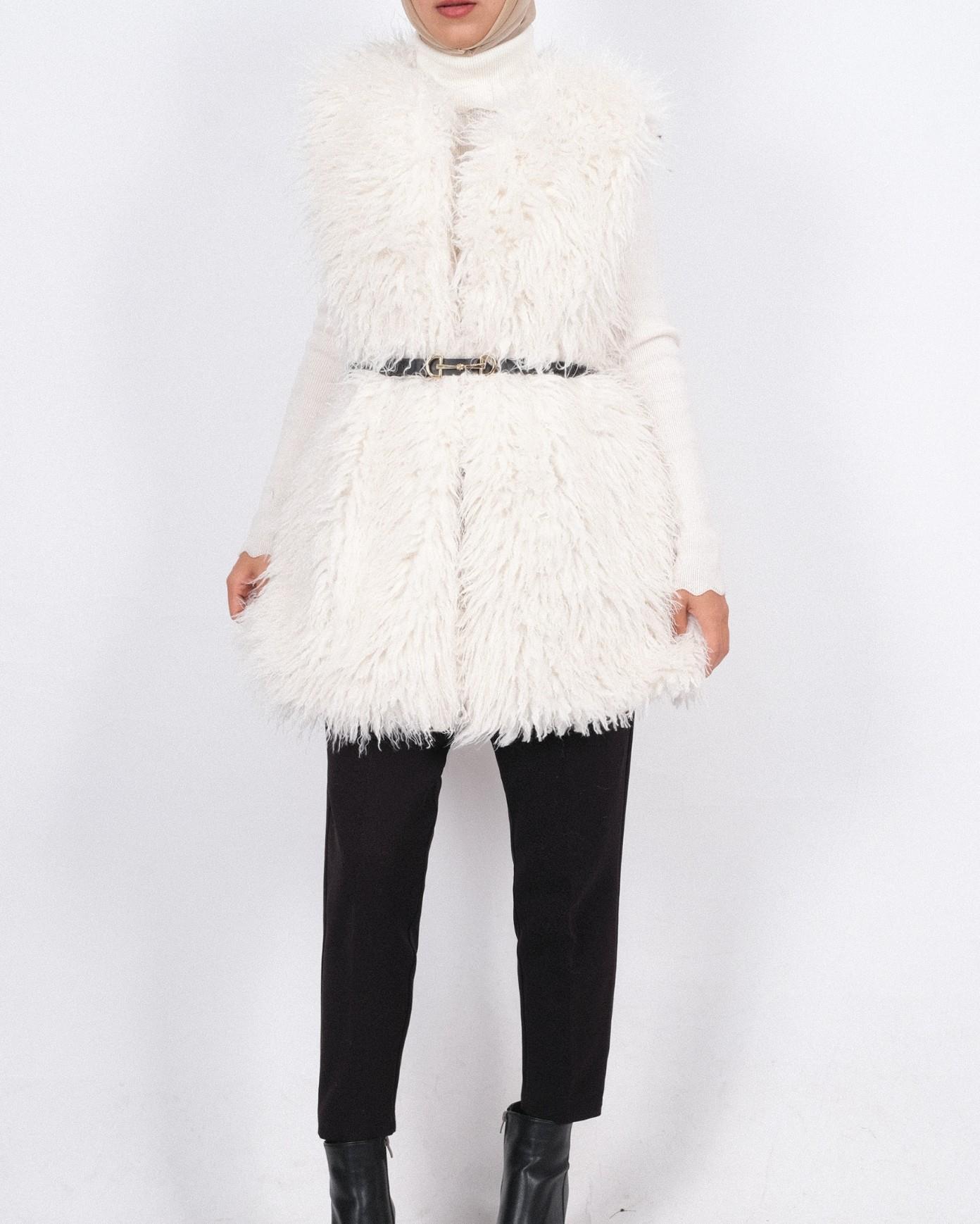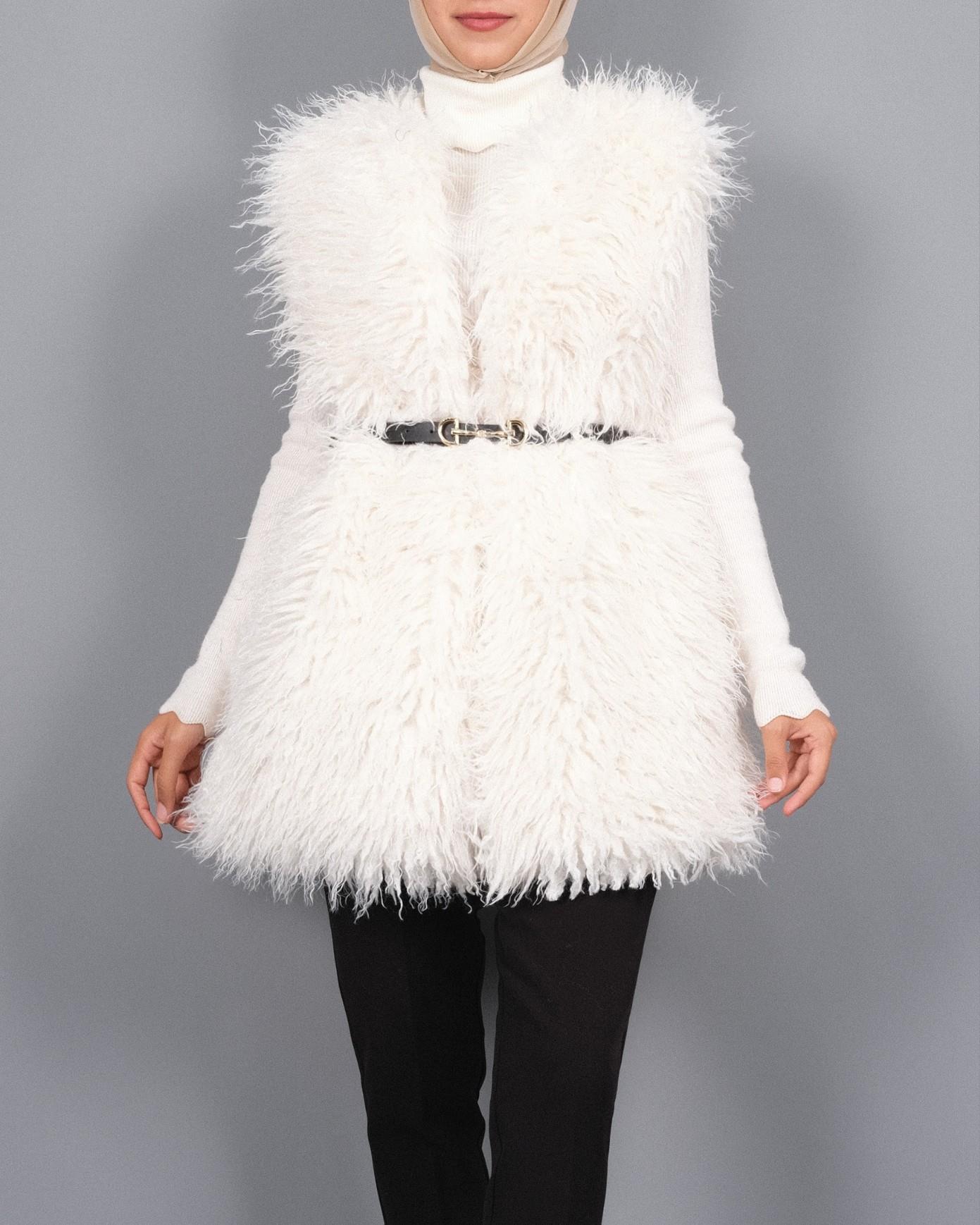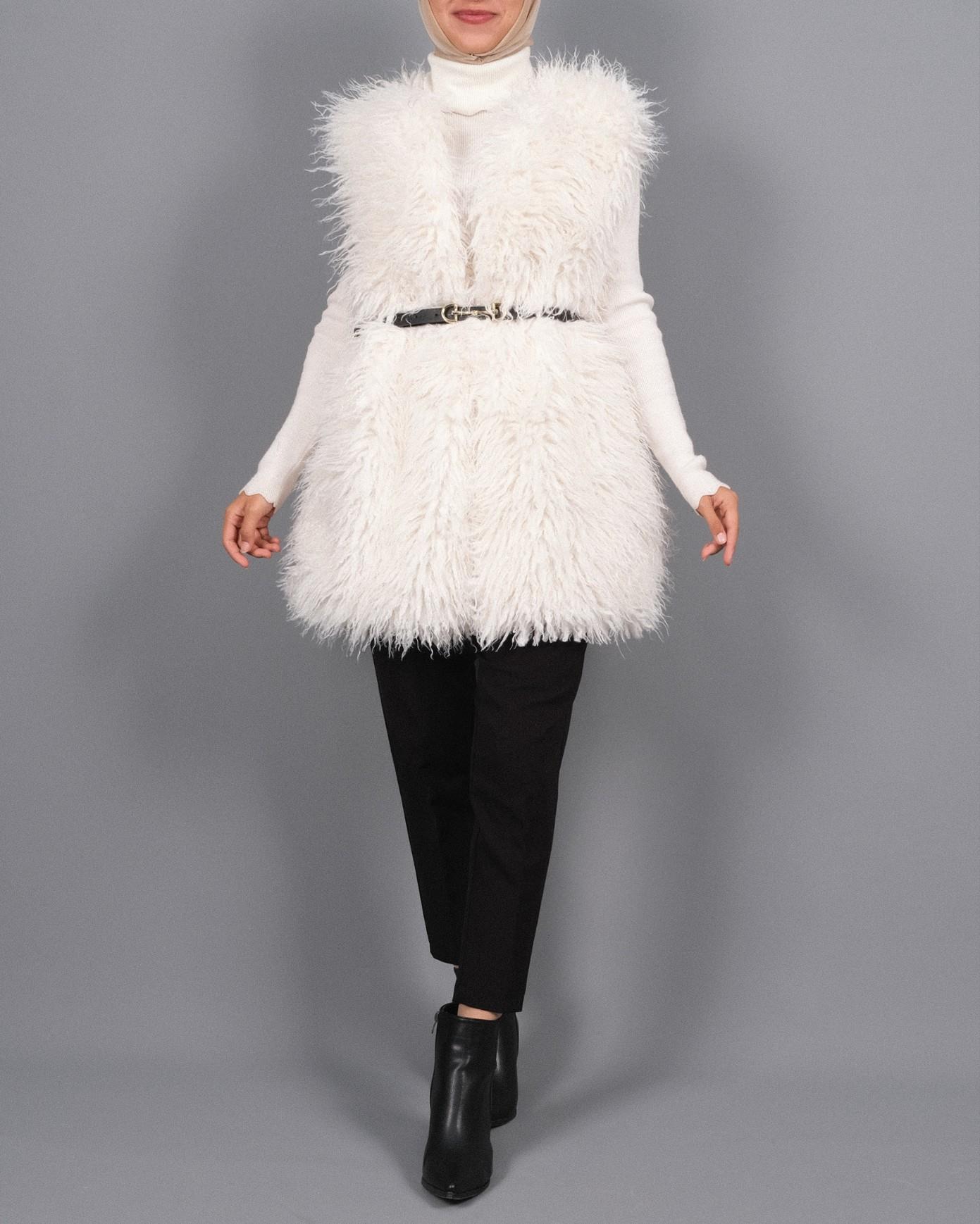 Kemerli Yan Cepli Kürklü Astarlı Yelek -Beyaz (111-70198-R02)