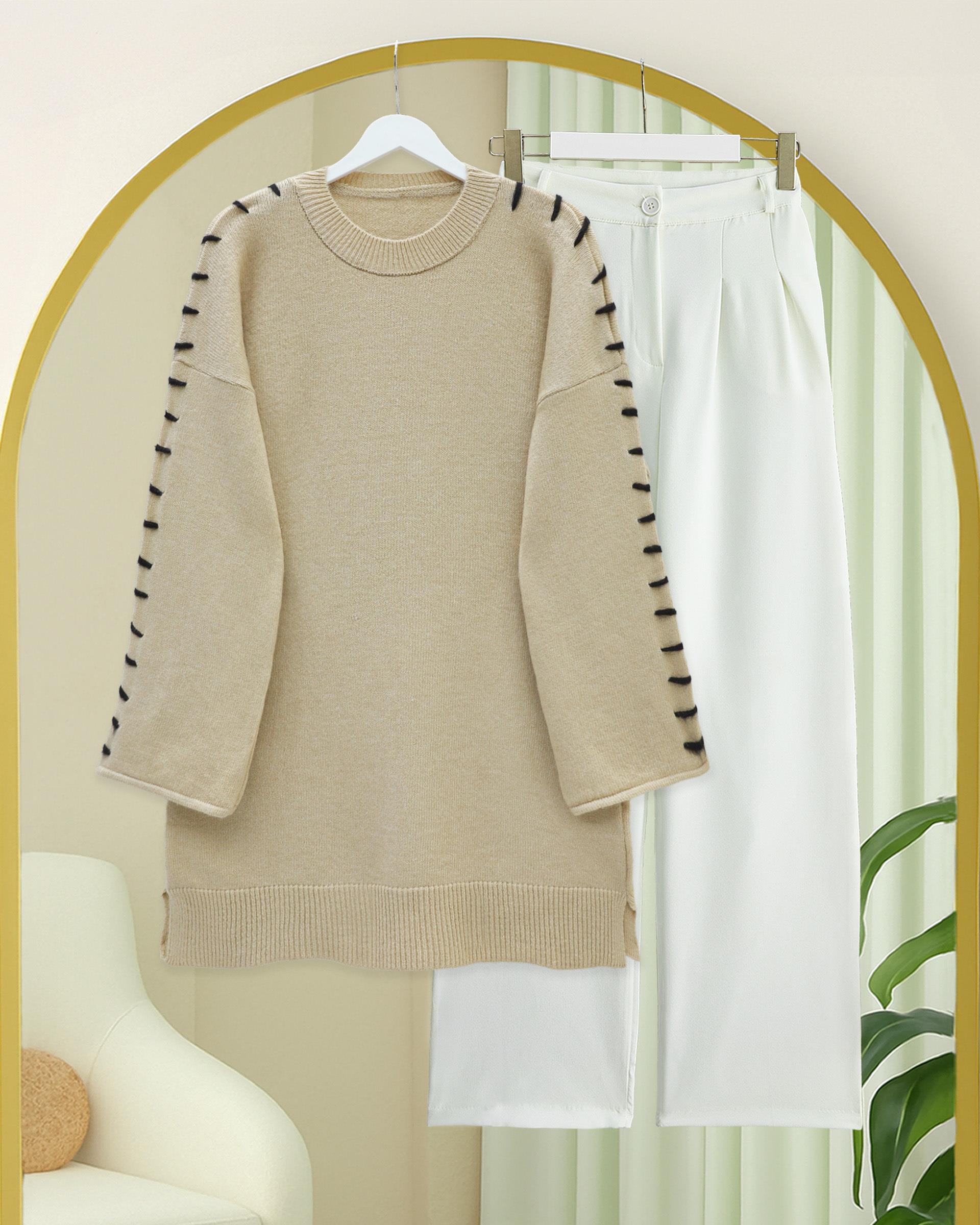 Kolları İpli Çizgili Yumoş Triko Tunik -Vizon (295-4522-R23)