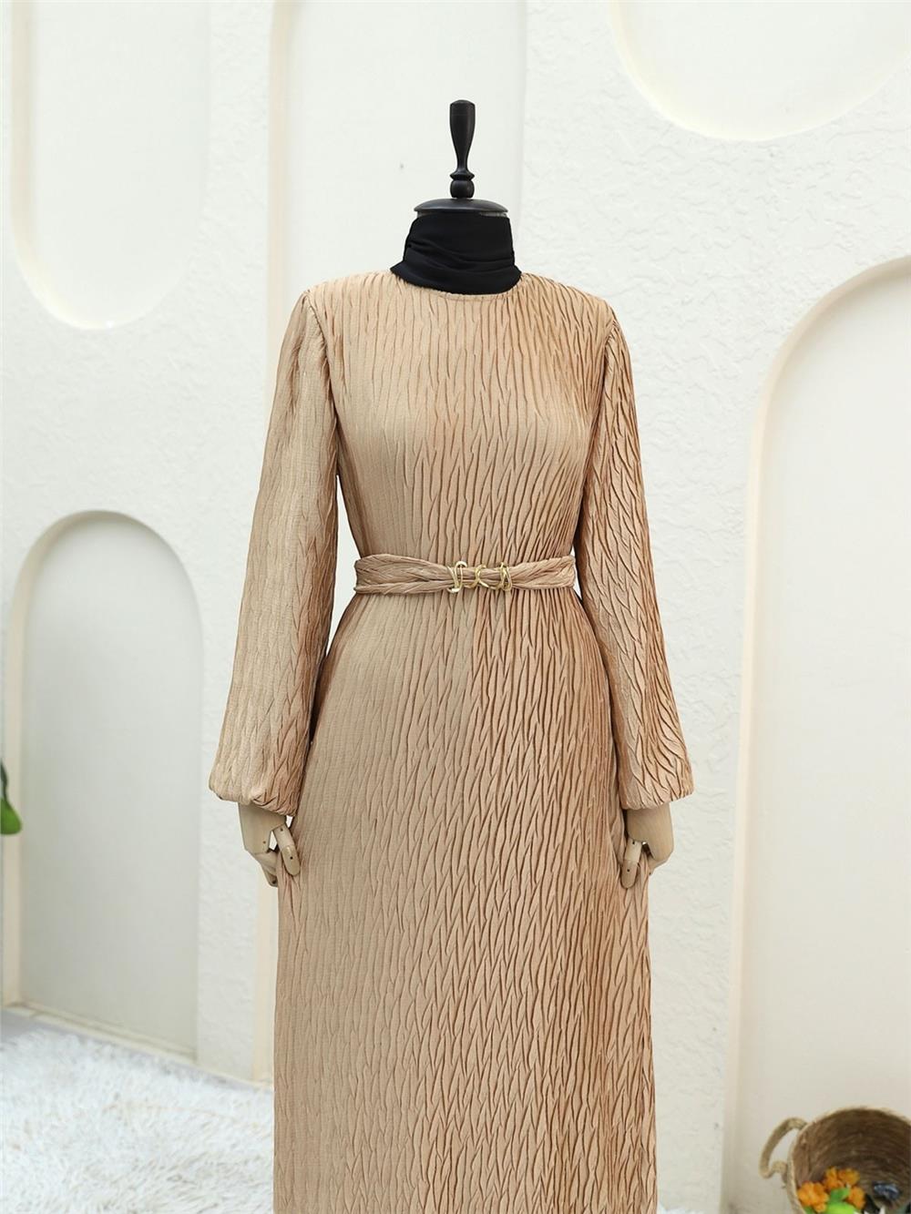 Kolu Lastikli Beli Kuşaklı Perde Piliseli Saten Elbise -Somon (407-2306-R13)