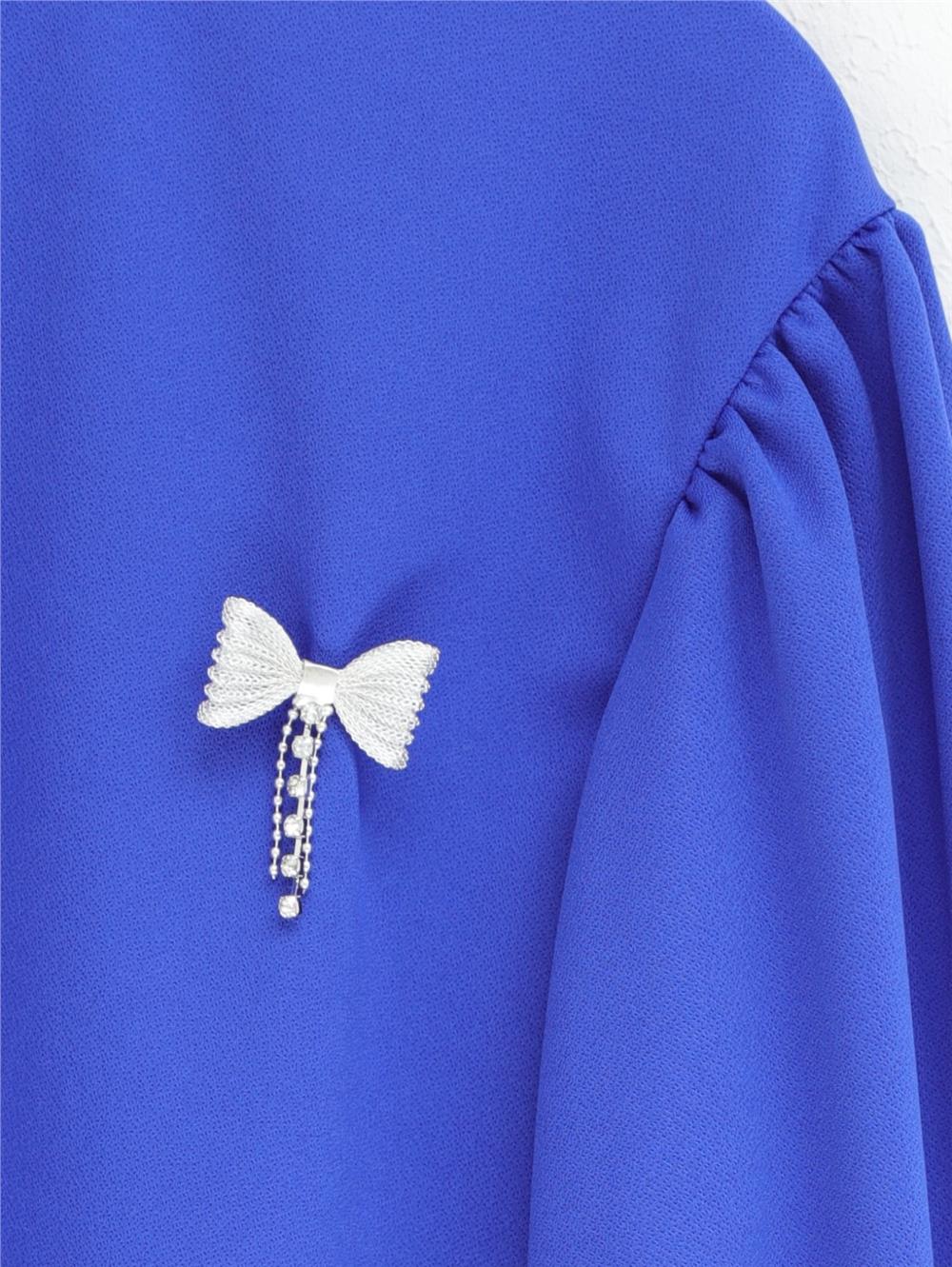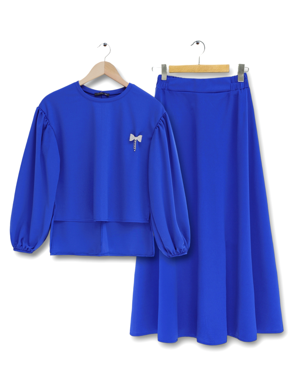 Bluzu bisiklet yaka, broş detaylı, balon kol, önü kısa arkası uzun; eteğinin beli lastikli takım modelimiz yeni sezonun en çok sevilen modelleri arasında yer almaktadır.