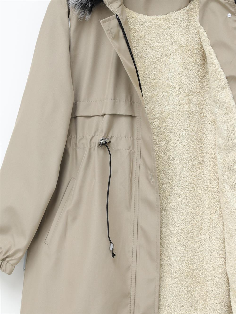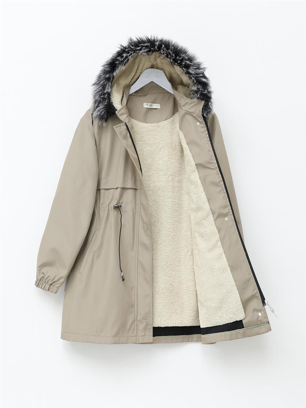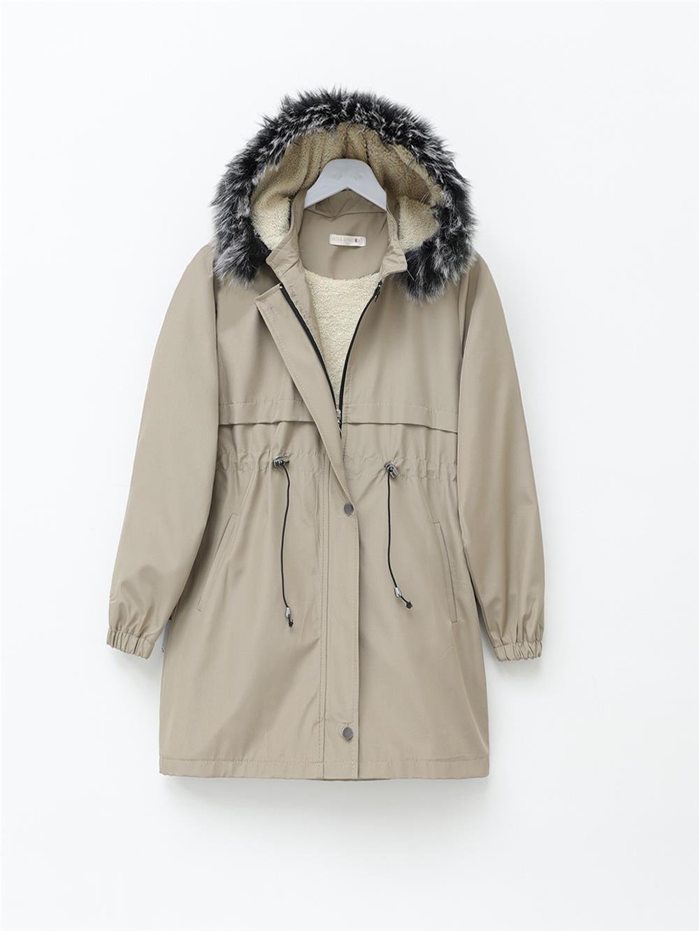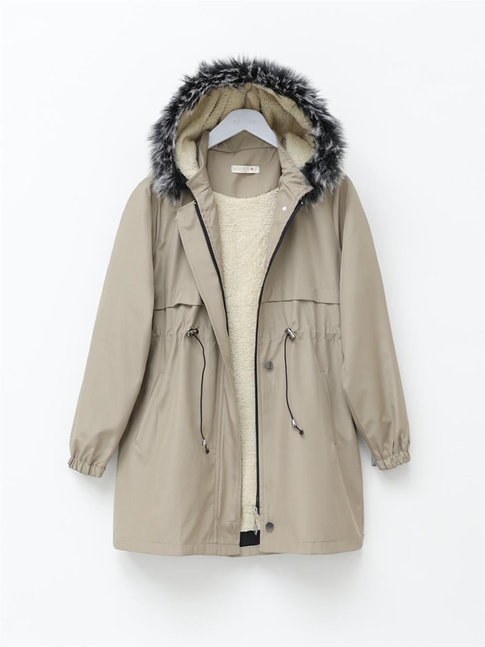 Kürklü Çıkma Kapşonlu Bağcıklı Bondit Kaban -Açık Vizon (192-08041-R51)