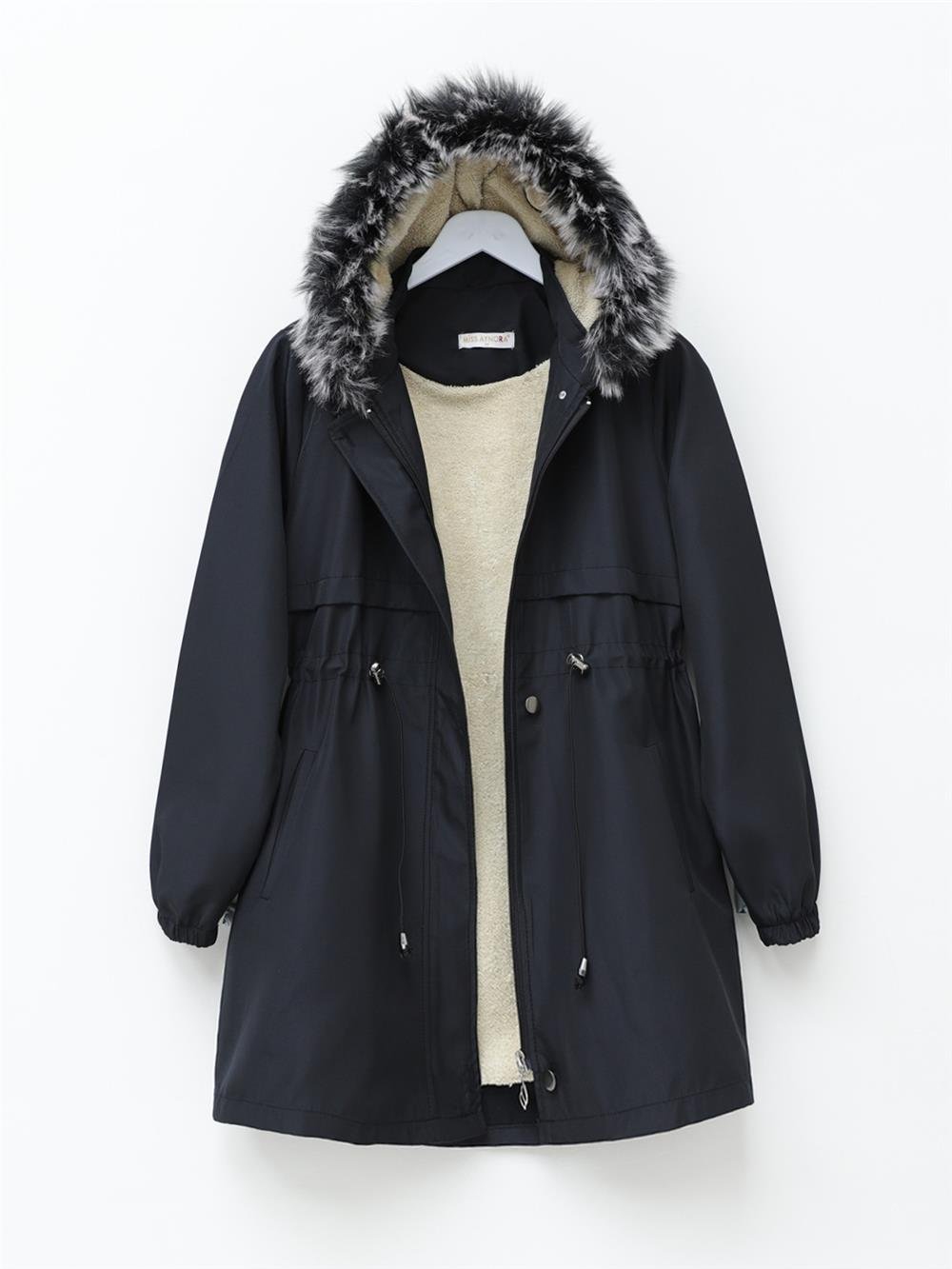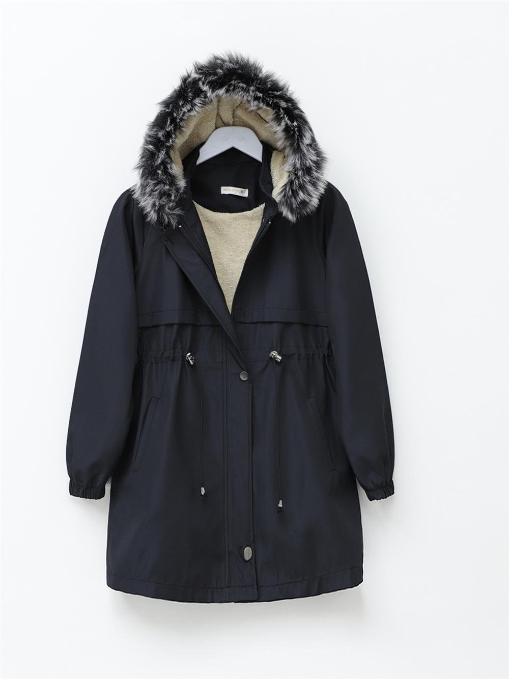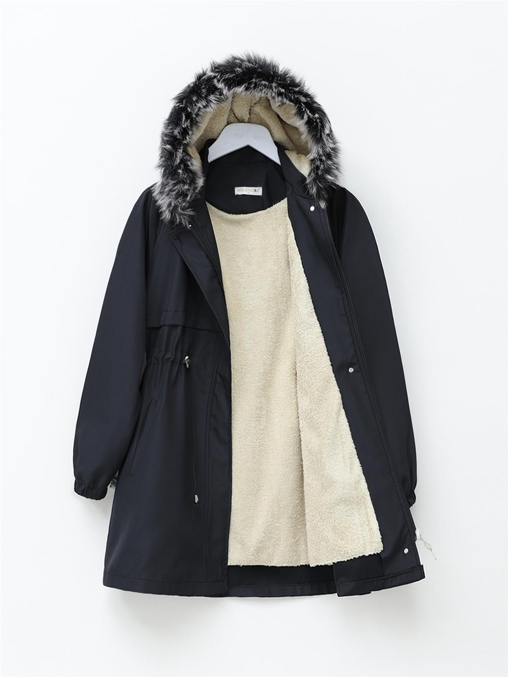 Kürklü Çıkma Kapşonlu Bağcıklı Bondit Kaban -Siyah (192-08041-R01)
