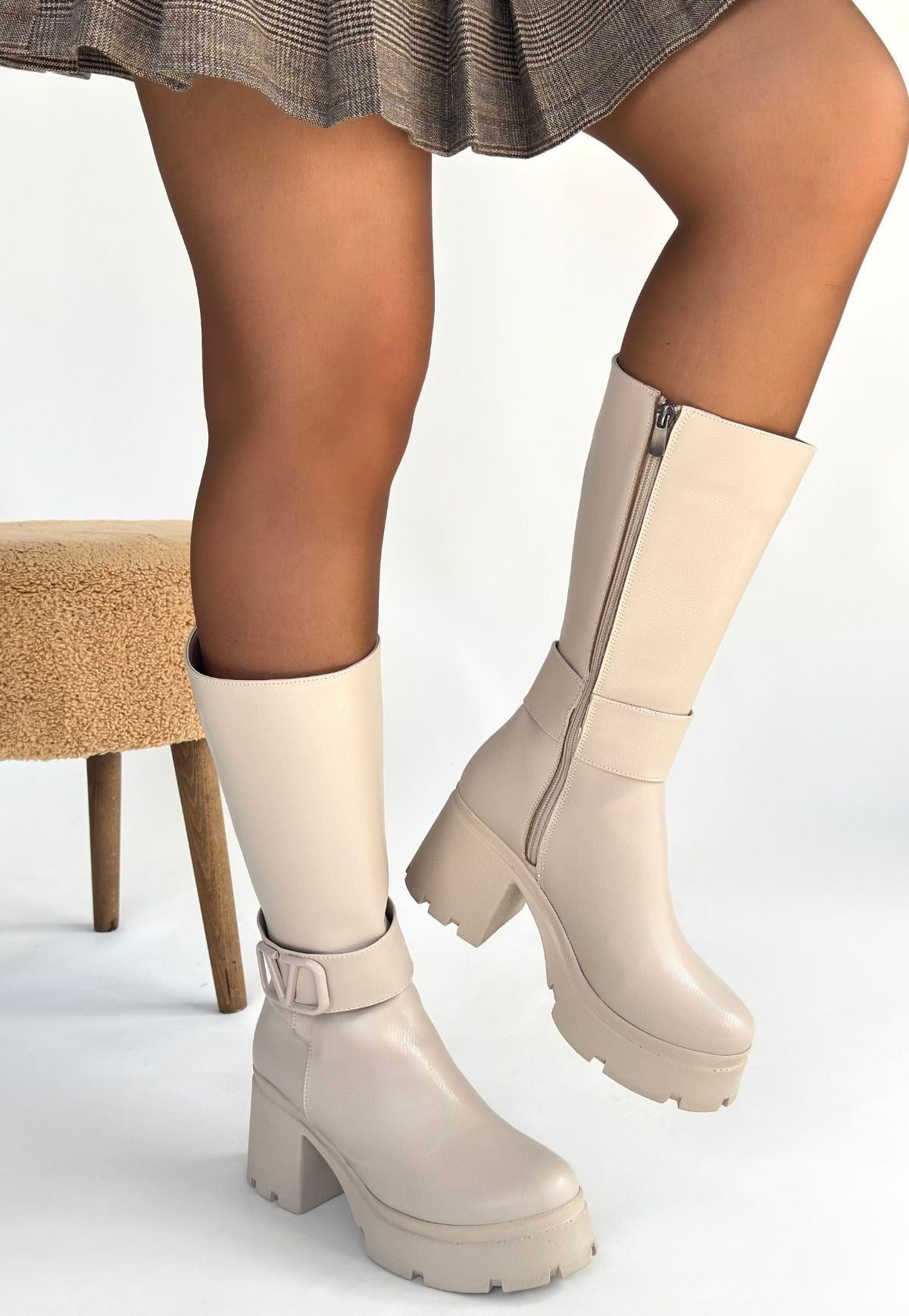 Moki Cilt Topuklu Çizme -Bej modeli, kadın çizme kategorisinde, bej rengiyle kış kombinlerinize şıklık katarken rahat kalıbıyla günlük kullanımda konfor sağlar.