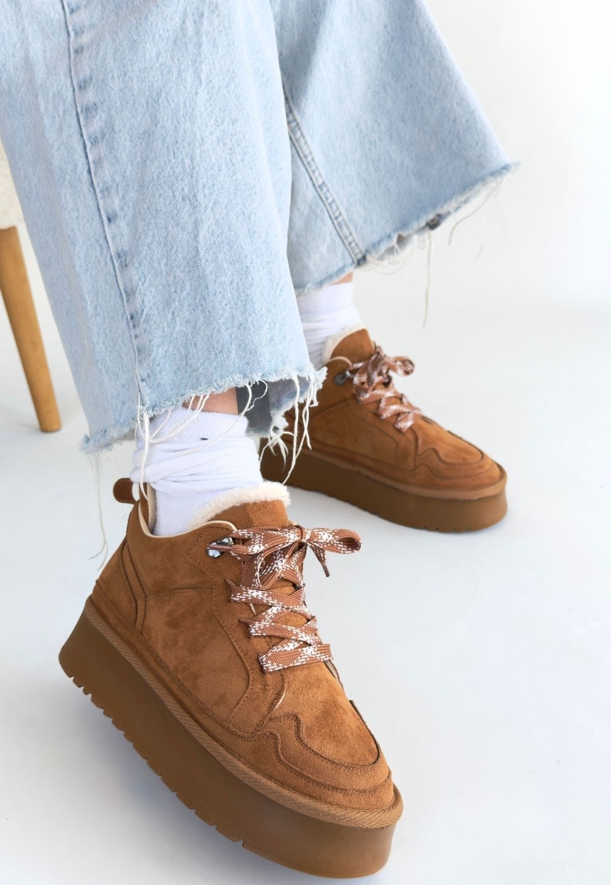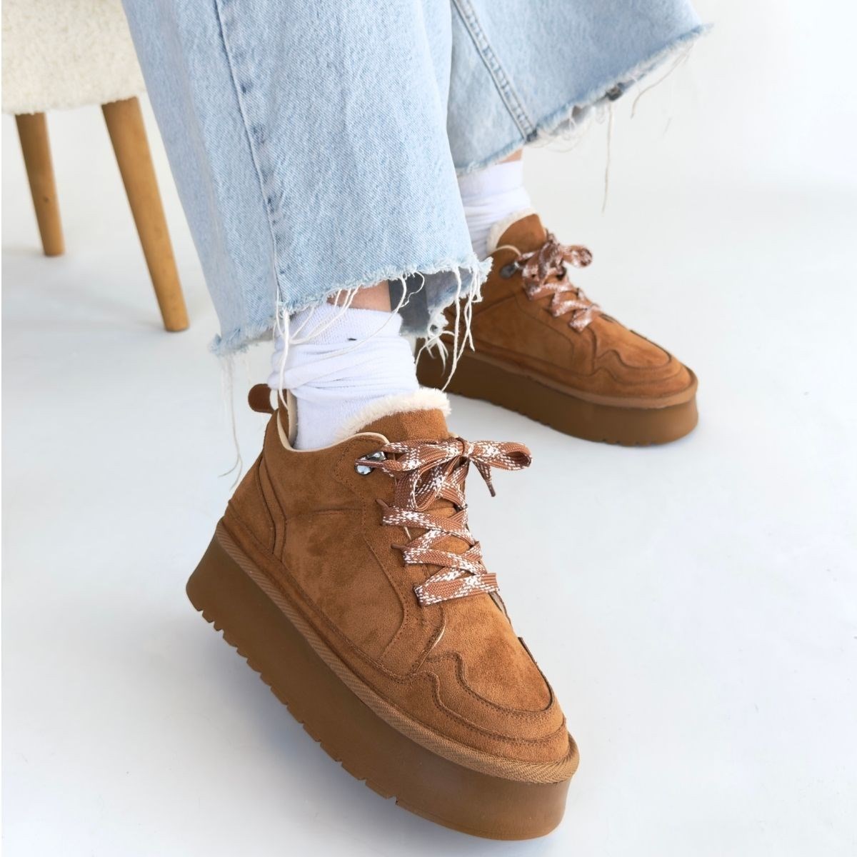 Muden Süet Bağcıklı Bot -Taba modeli, kadın bot kategorisinde, taba rengiyle soğuk havalarda hem şıklık hem de fonksiyonellik arayanlar için uygun bir seçenektir.