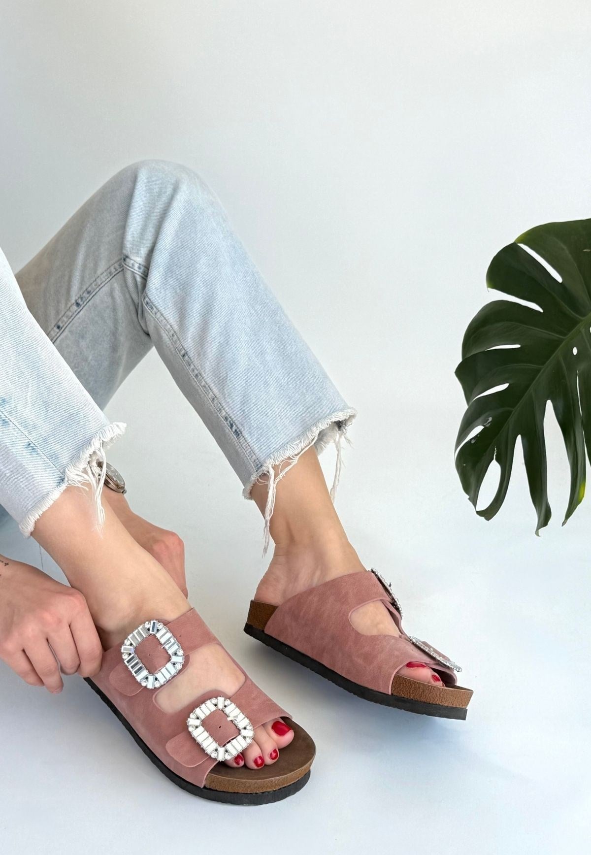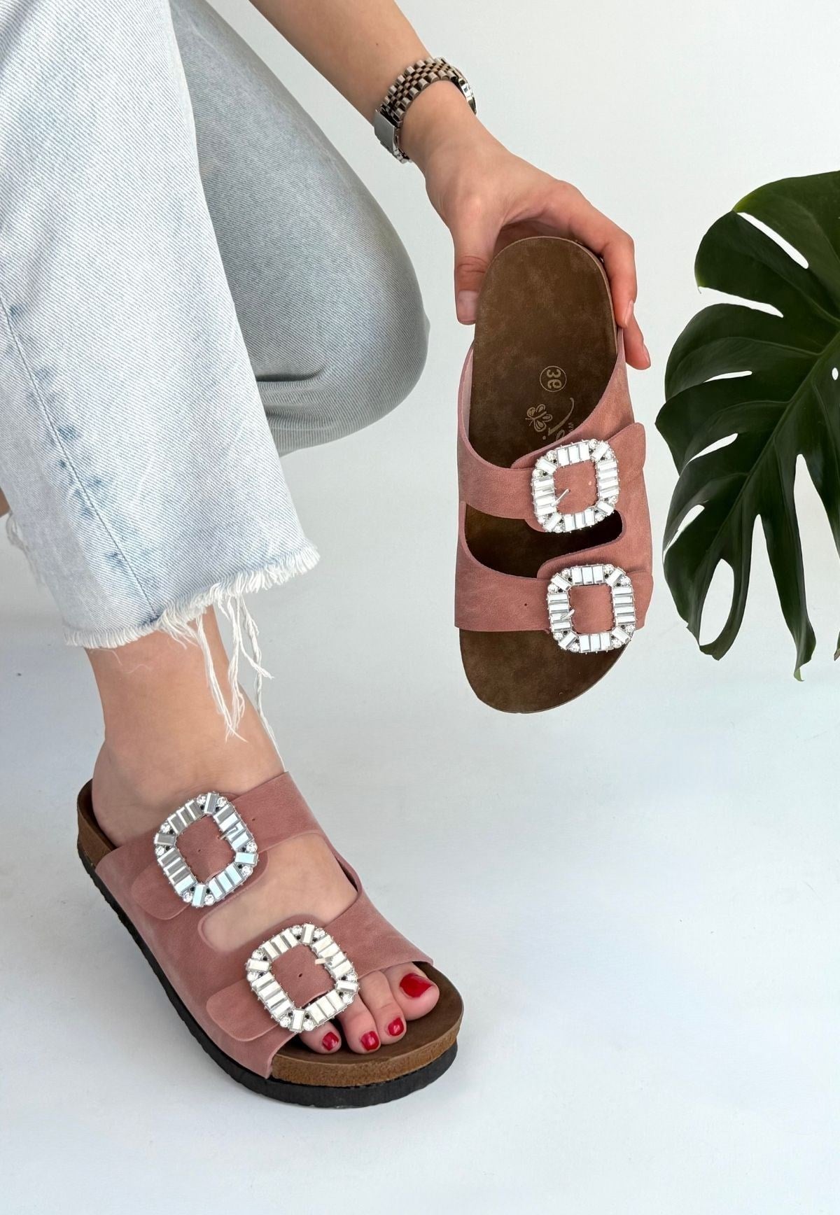 Nool Nubuk Terlik -Pudra modeli, kadın terlik kategorisinde, pudra rengiyle günlük ve özel gün kombinlerinde kullanılabilecek şık bir seçenektir.
