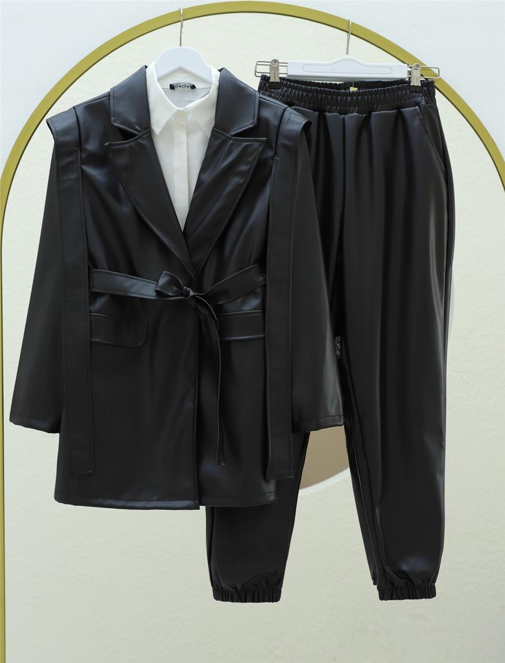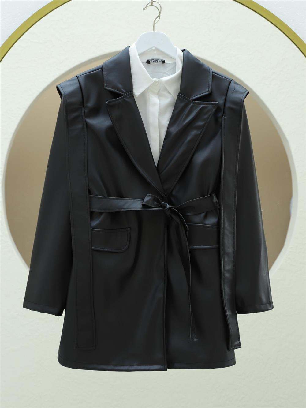 Omuz ve Cep Detaylı Kemerli Deri Ceket -Siyah (398-9027-R01)