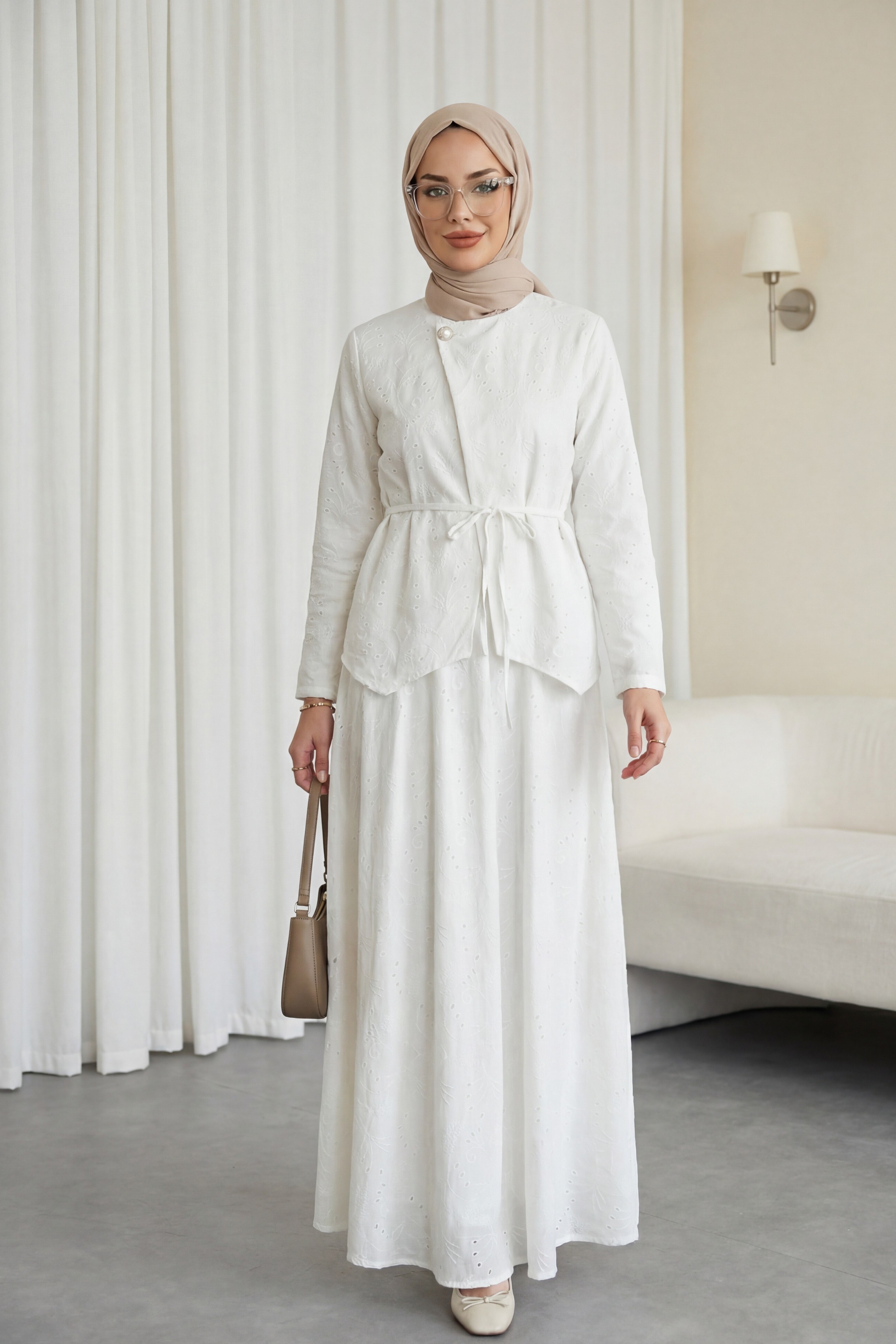 Kombindeki şal, çanta, ayakkabı ve takılar aksesuar olarak kullanılmıştır.