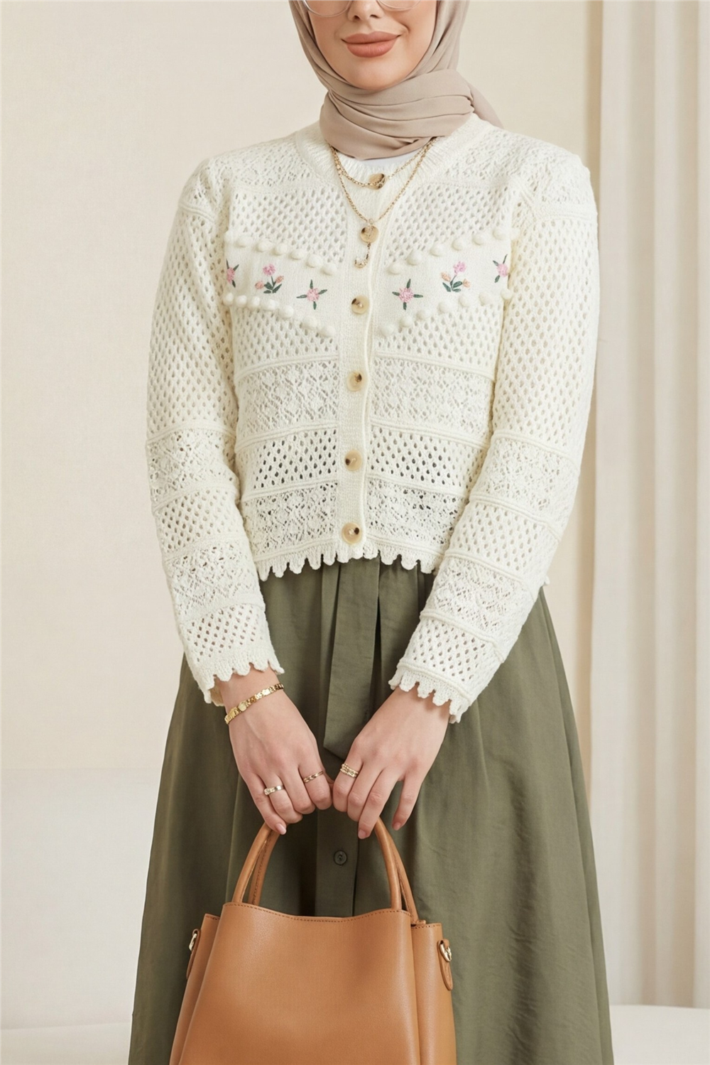 Önü Çiçek Nakışlı Ponponlu Düğmeli Triko Hırka, romantik ve sıcak bir stil sunar. Çiçek nakış detayları zarif bir dokunuş katarken, ponpon ve düğme detayları tasarıma hareket kazandırır. Yumuşak triko dokusu gün boyu konfor sağlar. Günlük kombinlerde kolayca tercih edilir.