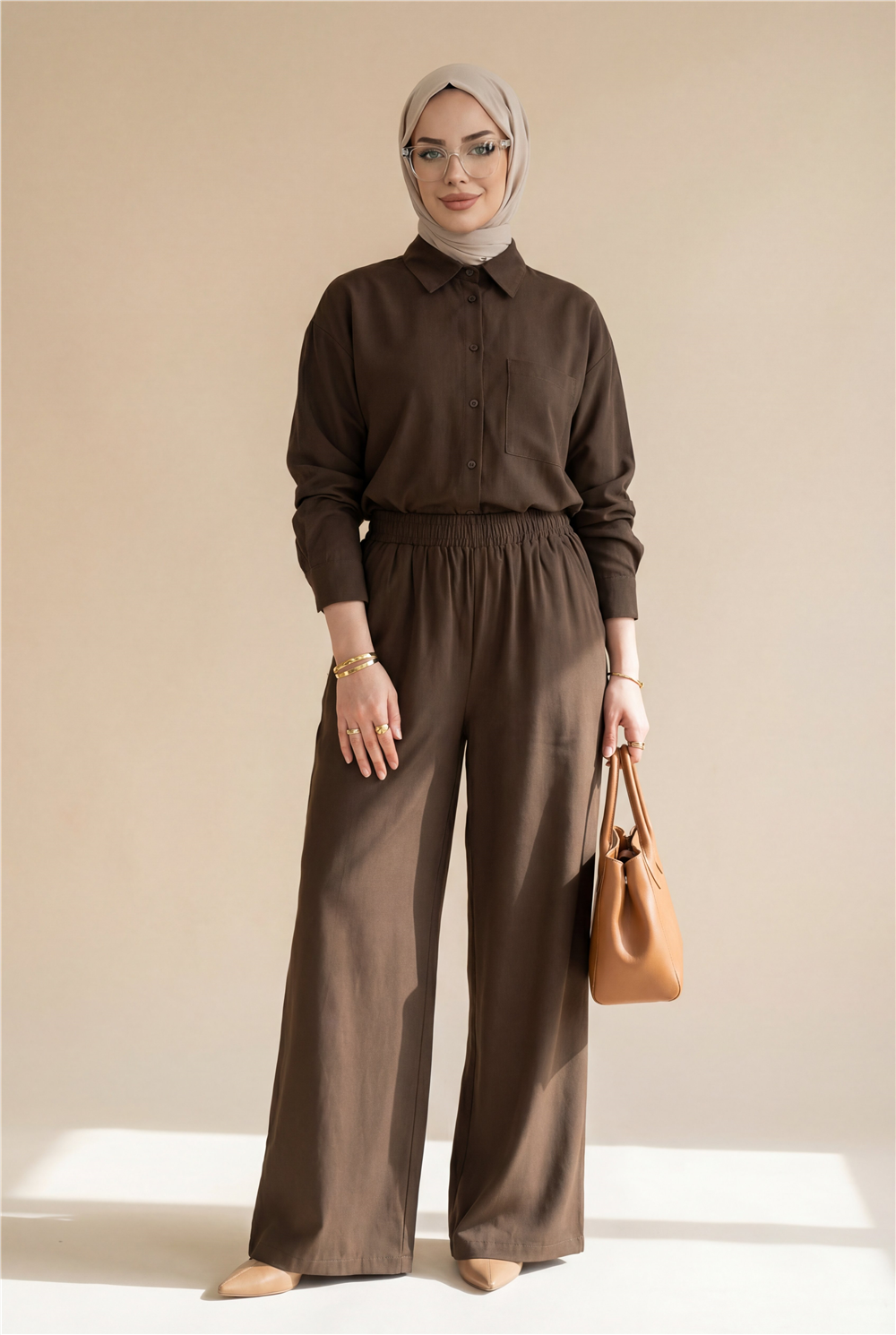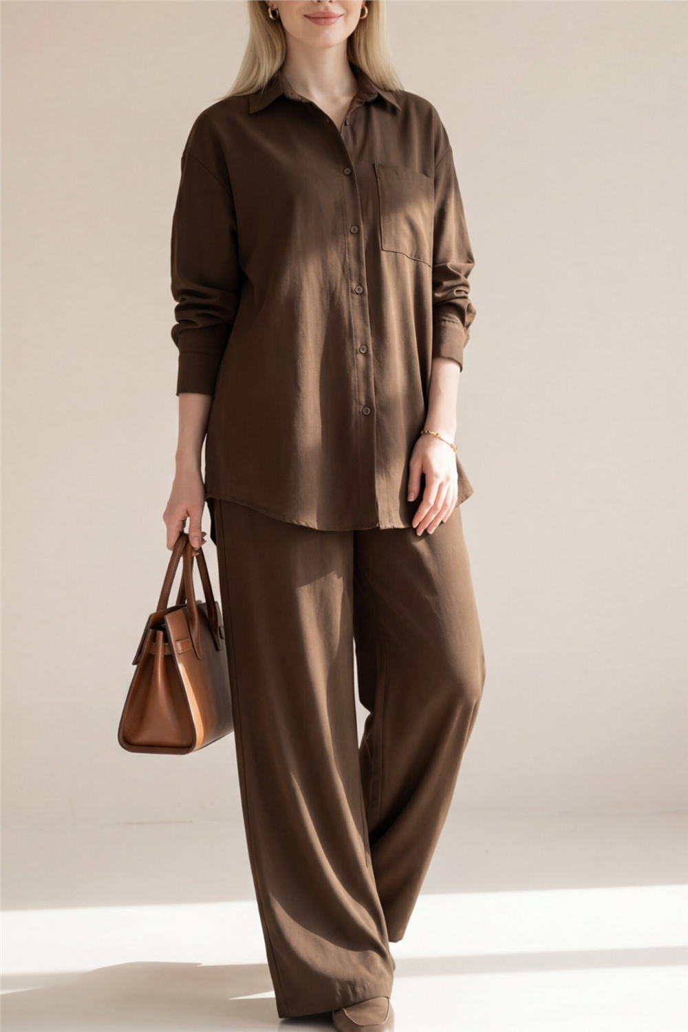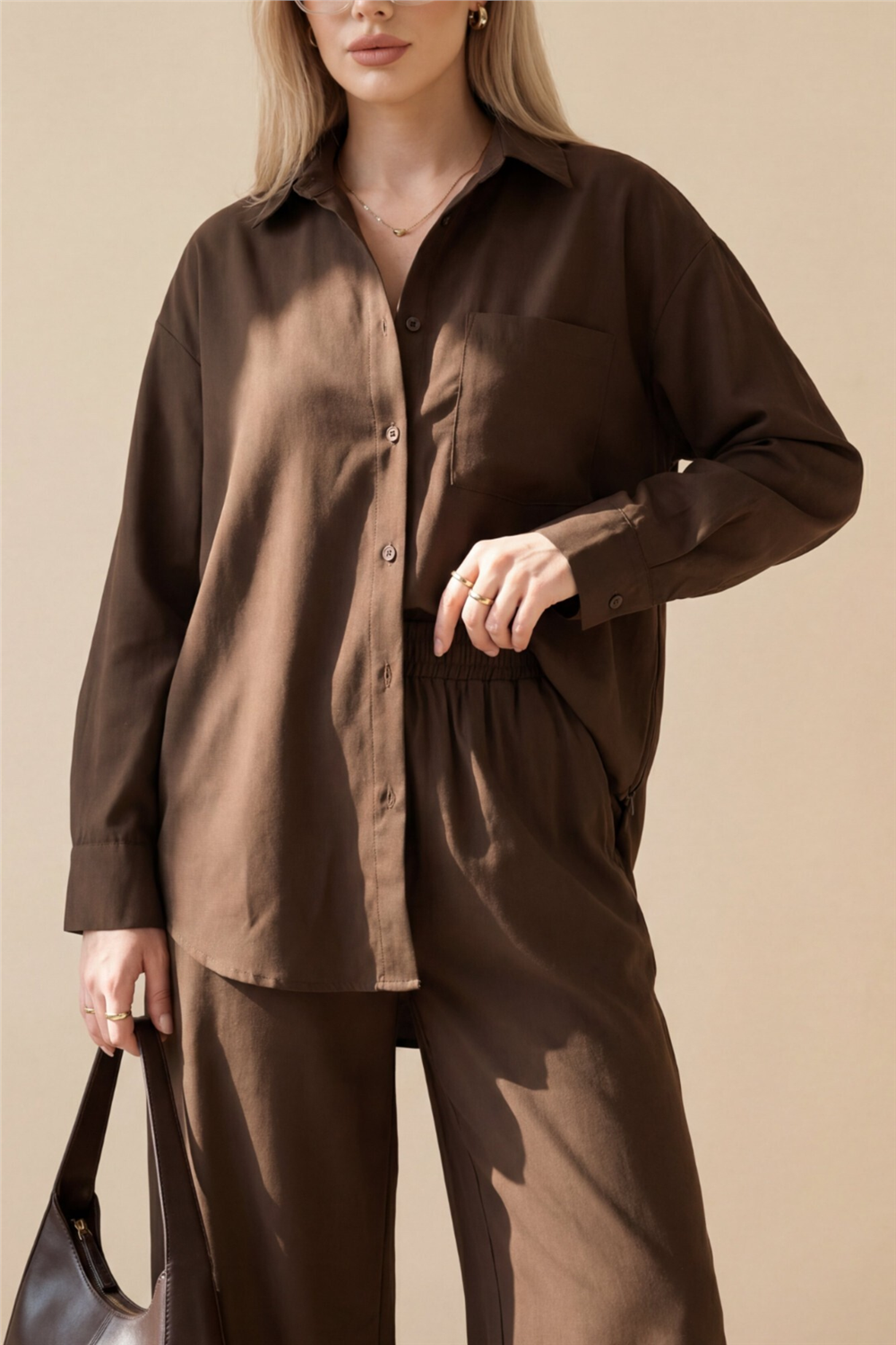 Zamansız tasarımı ve konforlu kesimiyle öne çıkan Önü Düğmeli Tek Cepli Gömlek Pantolon Takım, hem günlük hem de ofis şıklığı için ideal bir tercih! Ön kısmındaki düğmeli form klasik ve düzenli bir görünüm sunarken, tek cep detayı tasarıma sade ve modern bir hava katar. Gömlek ve pantolondan oluşan takım formu sayesinde zahmetsiz ve bütüncül bir stil oluşturur. Rahat kesimi ve akışkan yapısı gün boyu konfor sağlarken, vücuda oturan fakat sıkmayan ideal kalıbı ile dengeli ve estetik bir siluet sunar. Günlük kombinlerden iş stiline kadar geniş bir kullanım alanına sahiptir.