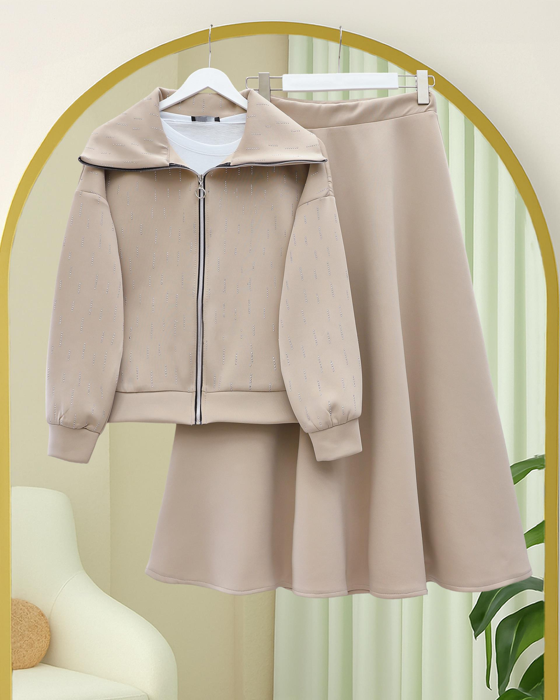 Önü Fermuarlı Boğazlı Taş Detaylı Scuba Takım -Bej (349-7099-R56)