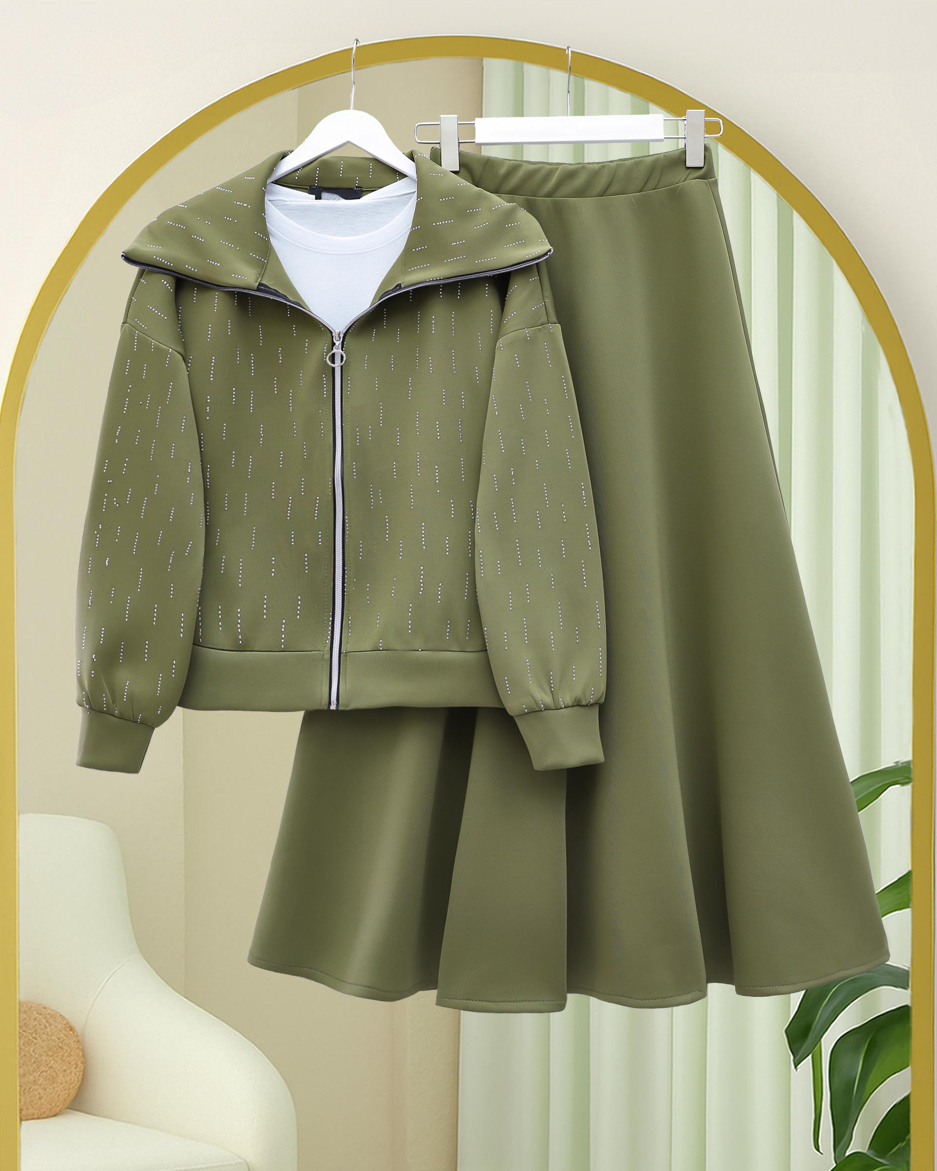 Uyumlu iki parçalı takım, Haki rengiyle kusursuz bir kombin sunar.