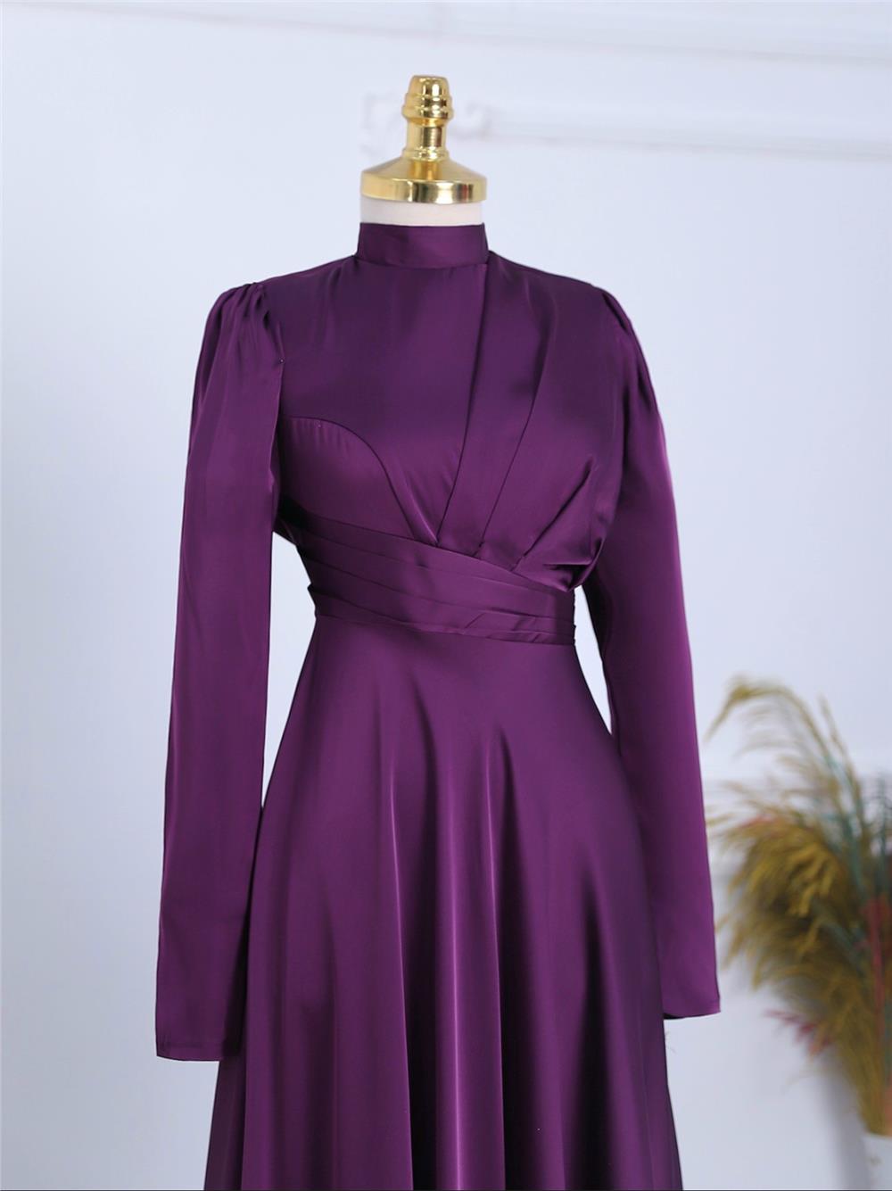 Önü Pliseli Saten Abiye -Mor (337-6759-R34)