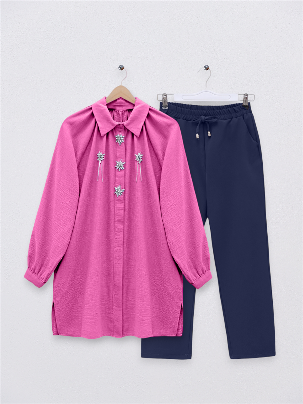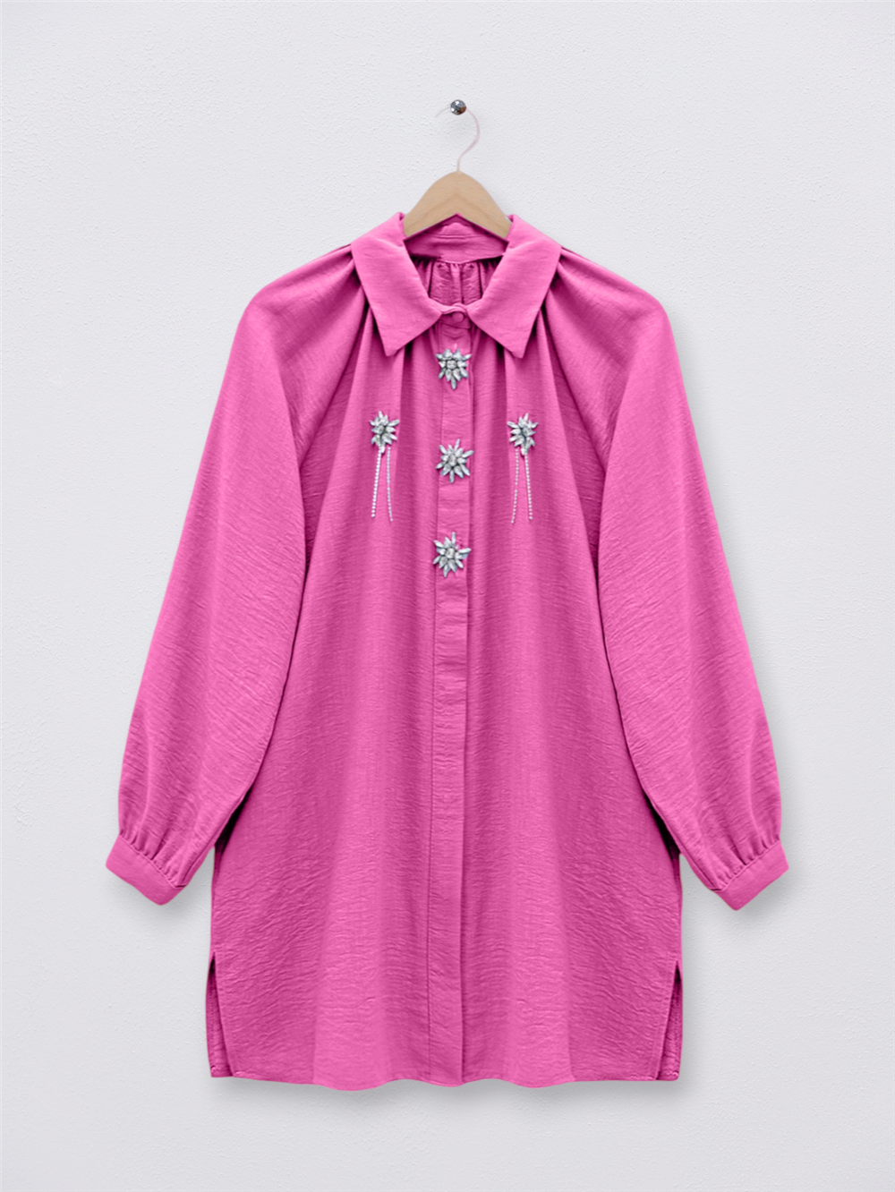 Önü Taş Detaylı Düğmeli Cepli Gömlek -Fuşya (338-20540-R14)