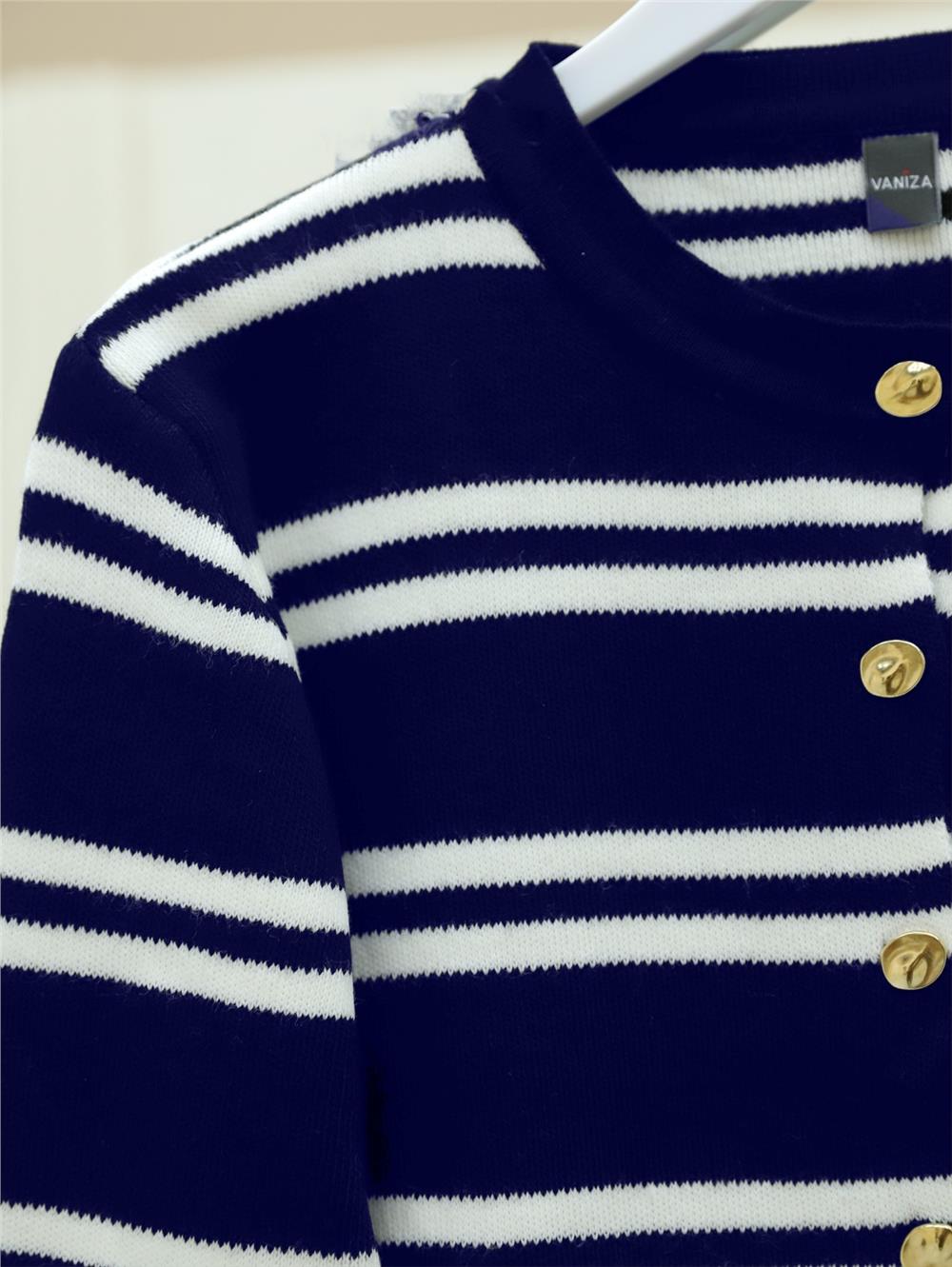 Parlak Düğmeli Çizgili Triko Hırka, zarif çizgili deseni ve parlak düğme detaylarıyla şıklığınızı tamamlar. Hem günlük kombinlerde hem de ofis stilinizde rahatlıkla tercih edilebilecek bu parça, her dolaba şıklık katar.